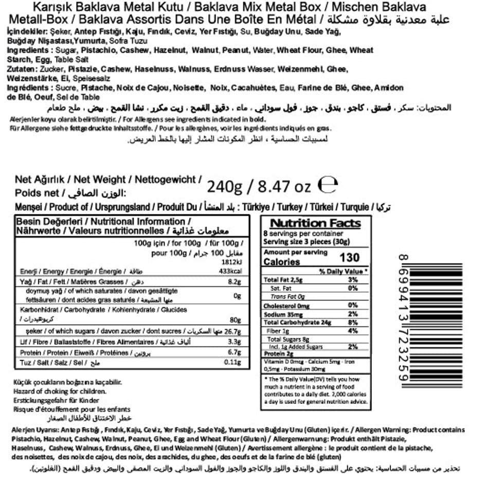 • PURE AND NATURAL INGREDIENTS: As Cerez Pazari we dedicate our selves to introduce you traditional and purest baklava gift box freshly hand made in Istanbul, Turkey. You can feel the difference of quality as soon as you open the lid, smelling the great scent of nuts. Our baklava contains Wheat Flour (Gluten), Butter Ghee, Pistachio, Hazelnut, Cashew Sugar, Wheat Starch. No Preservatives, No Artificial Colors, No Artificial Flavors, Non GMO, No Glucose Syrup..