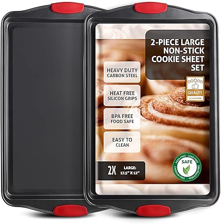 Baking Sheet Set, 2-Piece Large Cookie Sheet Set with Silicone Handles, Steel Baking Pan, Baking Sheets for Oven, BPA Free Cookie Sheets for Baking Nonstick Set, Premium Sheet Pan, Black Baking Tray