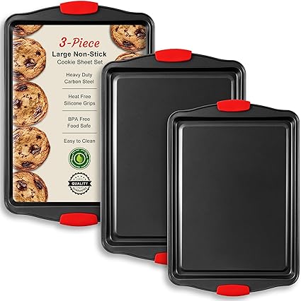 Baking Sheet Set, 3-Piece Cookie Sheet Set with Silicone Handles, Steel Baking Pans Set, Durable Baking Sheets for Oven, BPA Free Cookie Sheets for Baking Nonstick Set, Sheet Pan - Black Baking Tray