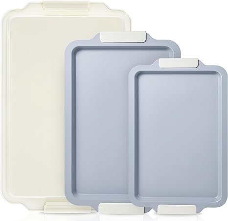 Non Stick Ceramic Baking Sheet Pan Set of 3, Natural Non Toxic Cookie Sheets for Baking - PFOA, PTFE Free, Heavy Duty Aluminized Steel Oven Trays for Cooking with Silicone Handles, Cream