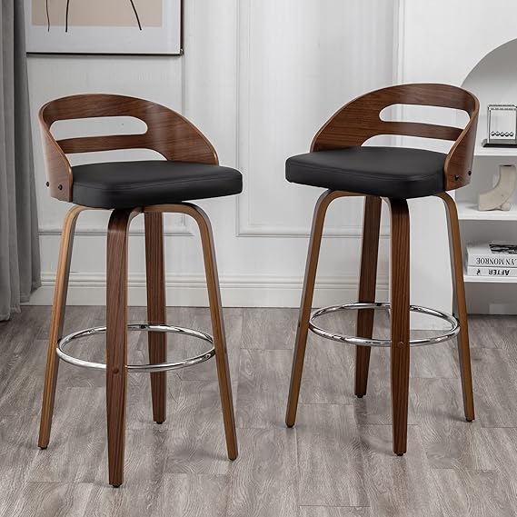 Bar Stools Set of 2, Swivel Bar Height Stools with Low Back, Wood Bar Chairs with Soft Cushion Seat, 24.6-Inch Seat Height (Black, 26" Counter Height)