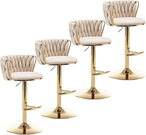 Gold Velvet Bar Stools Set of 4, Swivel Counter Height Bar Stools with Back, Adjustable Woven Barstools for Kitchen Island, Pub, Club (Beige)