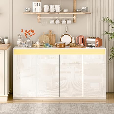 57" Kitchen Buffet Cabinet with Power Outlets - Pantry Storage Cabinet with LED Lights, Sideboard Cabinet Kitchen Storage Cabinets with 4 High Gloss Doors for Kitchen, Bathroom, White