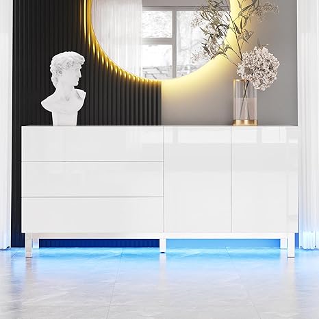 AMERLIFE 63" Modern Minimalist Sideboard Buffet Storage Cabinet with LED Lights, High Gloss Electroplated Console Table with Magnetic Doors & Drawers for Living Room, Dining Room, Entryway, White