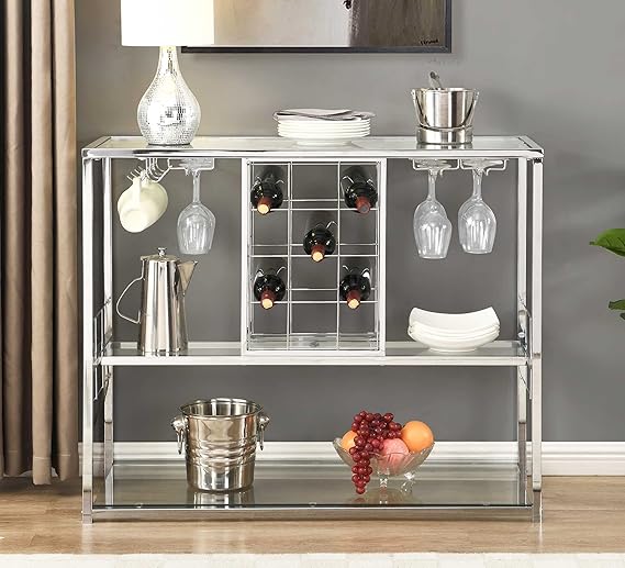 ASYA Wine Rack Table with Glass Holder, 3-Tier with Temered Glass Shelves, Modern Liquor Cabinet with Storage for Wine Bar, Living Room, Kitchen and Dining Room (Silver Finish)