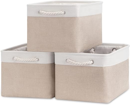 Bidtakay Large Fabric Baskets with Handles [3-Pack] Collapsible Storage Basket for Shelves 15 X 11 X 9.5 inches Canvas Bins for Closet Organization (White&Beige)
