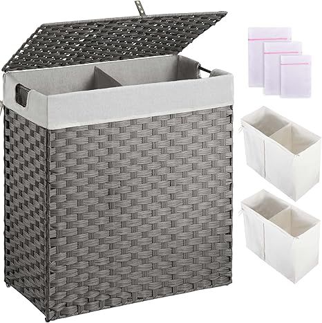 Greenstell Laundry Hamper with lid, No Install Needed, 110L Wicker Laundry Baskets Foldable 2 Removable Liner Bags, 2 Section Clothes Hamper Handwoven Rattan Laundry Basket with Handles, Gray