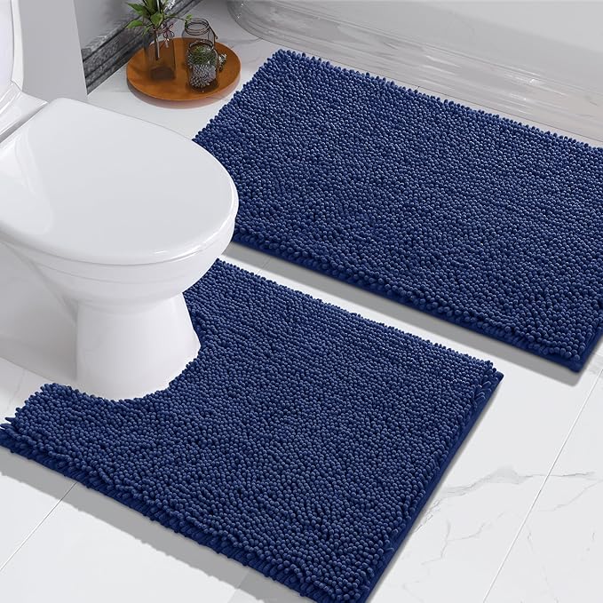 Yimobra Toilet Rug U-Shaped Set 2-Piece, Soft Absorbent Quick-Dry Contour Bathroom Rugs for Toilet, Machine-Washable, Toilet Bath Mat, Non-Slip, Bath Rugs for Bathroom, 32x20 + 24x20, Navy Blue
