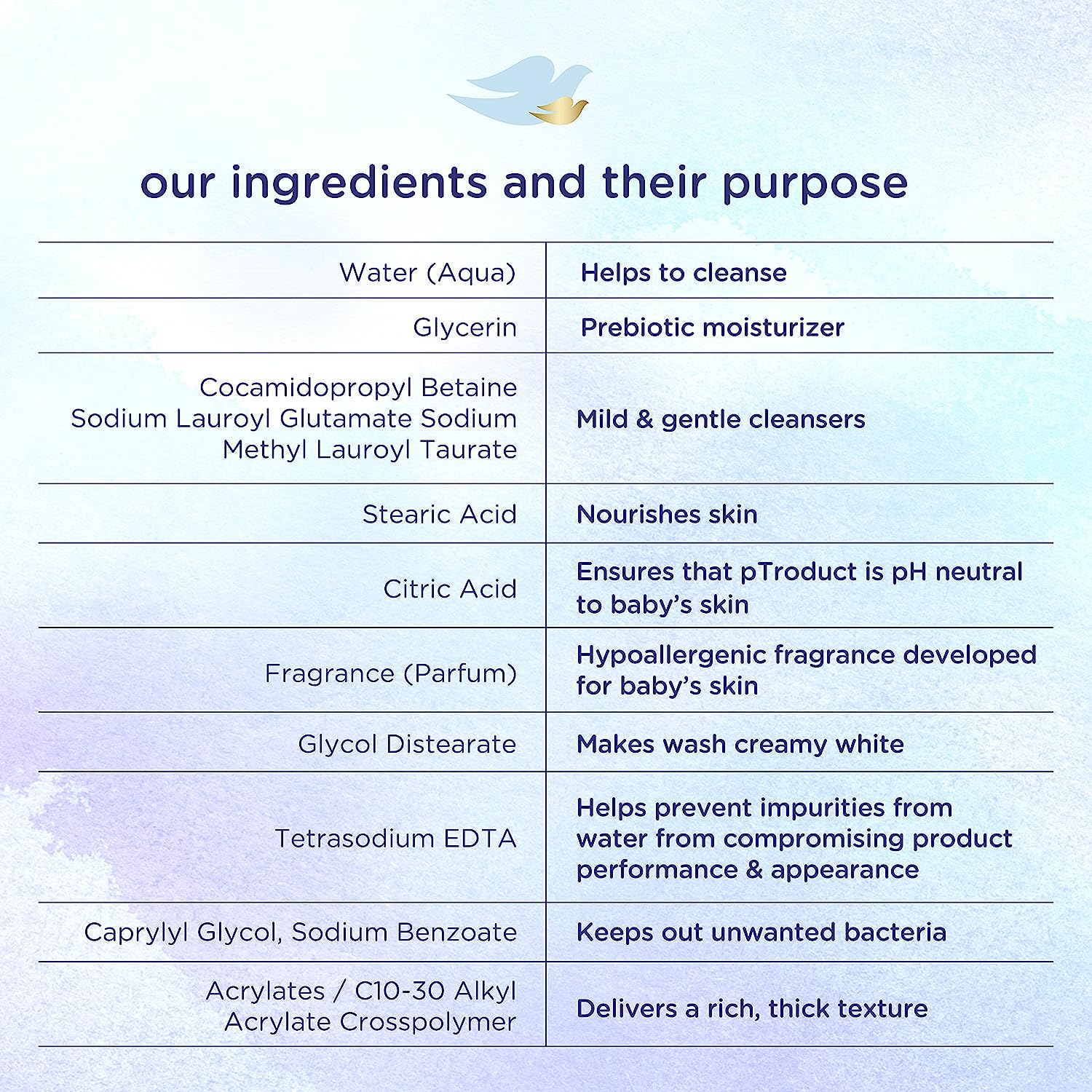 Baby bath time is special. And with baby skin being 30% thinner than ours, the best care is the gentlest. To help protect your little one’s delicate skin, we created Baby Dove Rich Moisture Hypoallergenic Baby Wash to help nourish and replenish your little one’s delicate skin during bath time. This tear-free and hypoallergenic baby wash for skin and hair ensures bath time is all about smiles, not tears. Made with 100% skin-natural nutrients, which are identical to those naturally found in skin, and prebiotic moisture to help replenish the essential moisture and nutrients that baby’s skin can lose during bath time. To use this baby wash, gently wet baby’s hair and skin with warm water, work into a lather, and rinse for touchably soft skin. This gentle wash is pediatrician recommended and dermatologist tested, and our caring formulas are created without dyes, parabens, phthalates or sulfates, so you can feel assured that this baby wash gives baby’s skin the complete care it needs. We know there’s no right or wrong way to be a parent – only your way. That’s why Baby Dove is here to help give you confidence that you’re providing the best skin care for your baby's skin. Our Tip to Toe Wash is sold in 6.5 oz., 13 oz., and 20 oz. bottles. Looking for something for your baby’s extra sensitive skin? Look for Baby Dove Fragrance Free Moisture Hypoallergenic Wash.