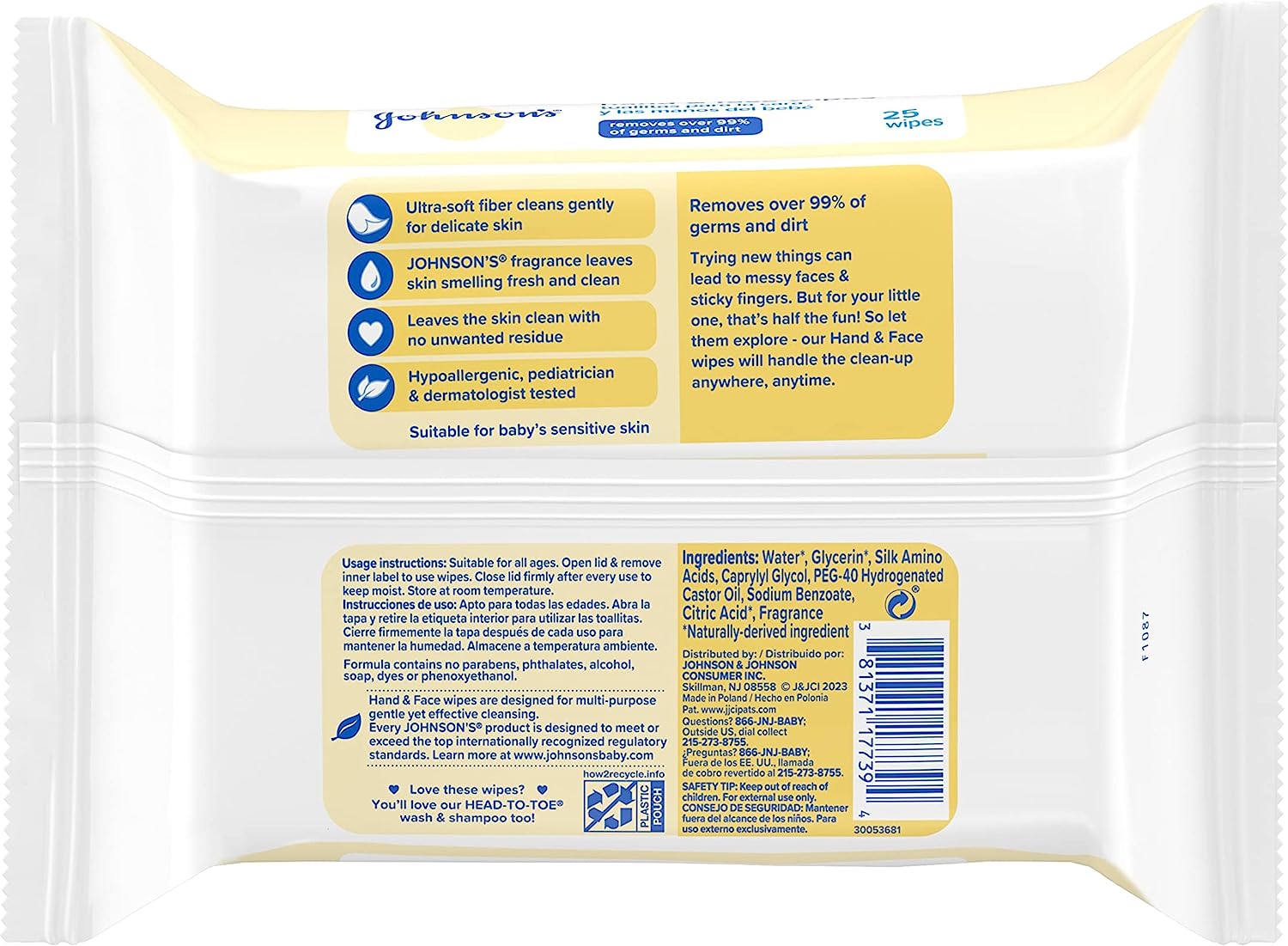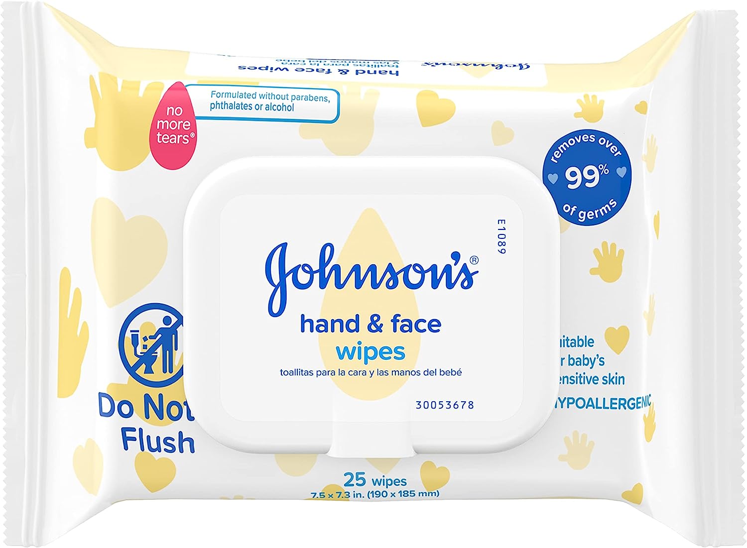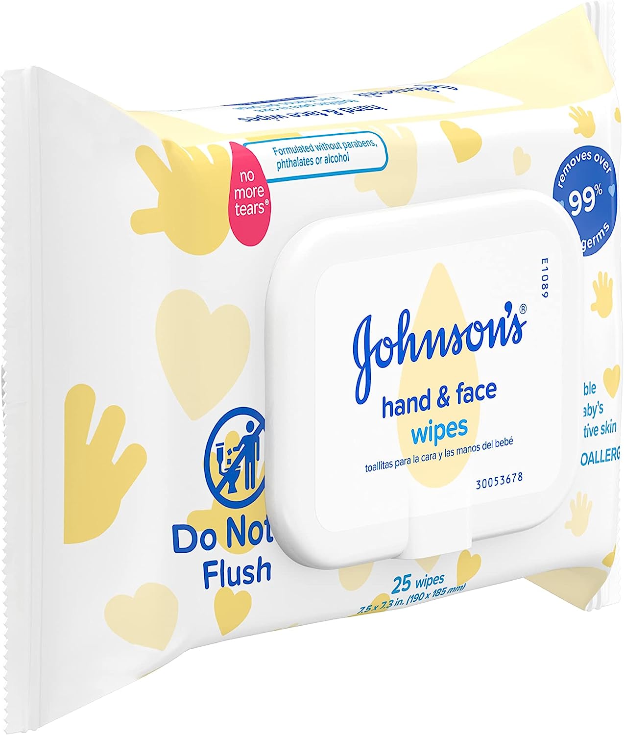 Baby's hands and face can get messy. That's why Johnson's Baby Hand and Face Cleansing wipes were designed to gently and effectively remove 99% of germs and dirt from baby's delicate skin while leaving it smelling fresh and clean. Made with our No More Tears formula, these pre-moistened and hypoallergenic, allergy-tested baby wipes are as gentle to baby's eyes as pure water. Johnson's Baby Hand and Face Cleansing Wipes are suitable for sensitive skin and are made free from alcohols, parabens, and phthalates. Pediatrician and dermatologist-tested, these wet wipes provide a refreshing clean with no unwanted residue without the need for water. Great for on-the-go, these disposable baby wipes come in a handy re-sealable package for quick and easy cleansing anywhere, anytime.