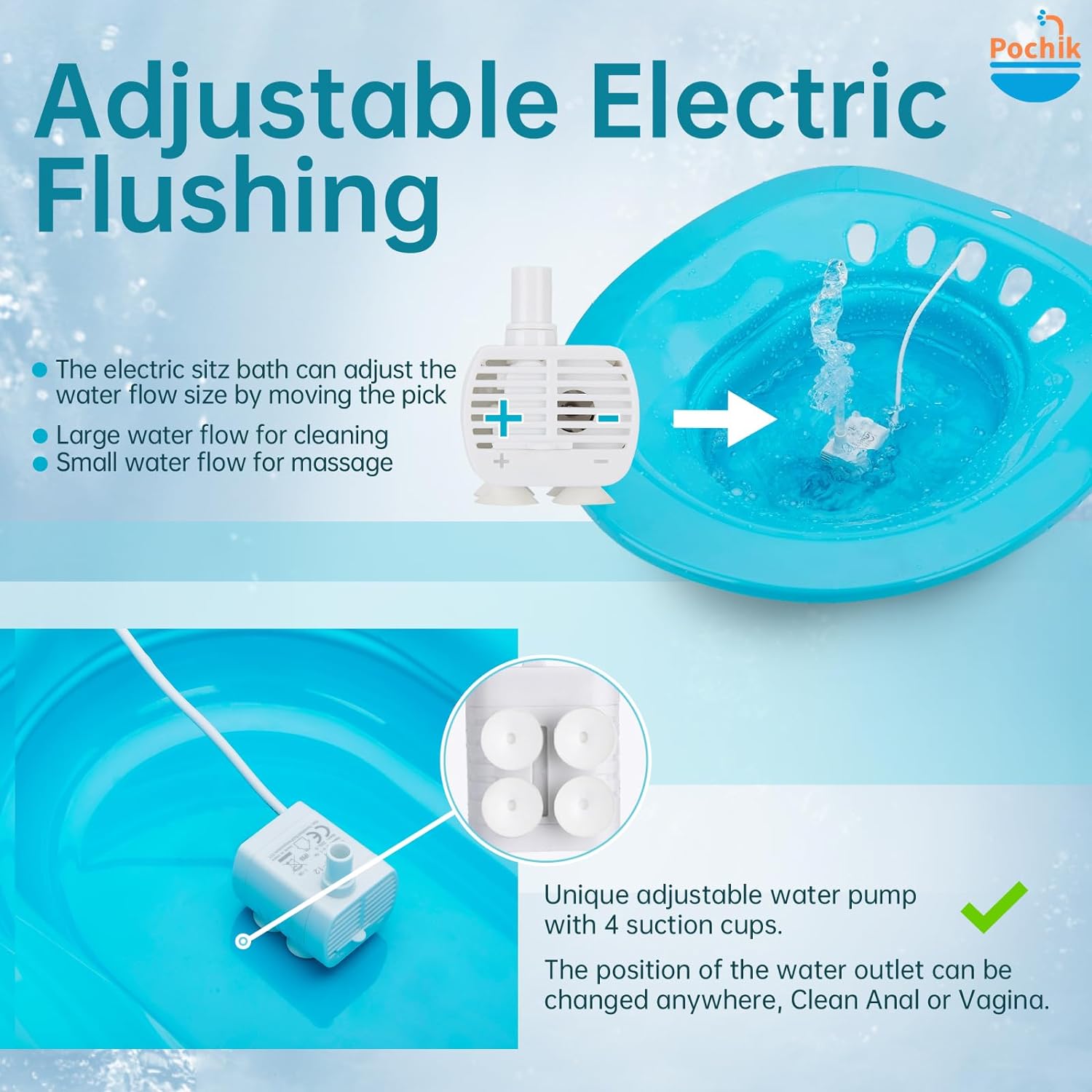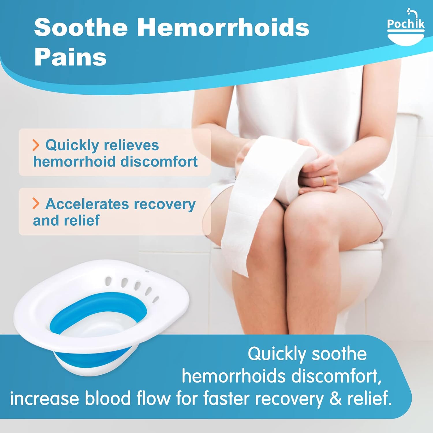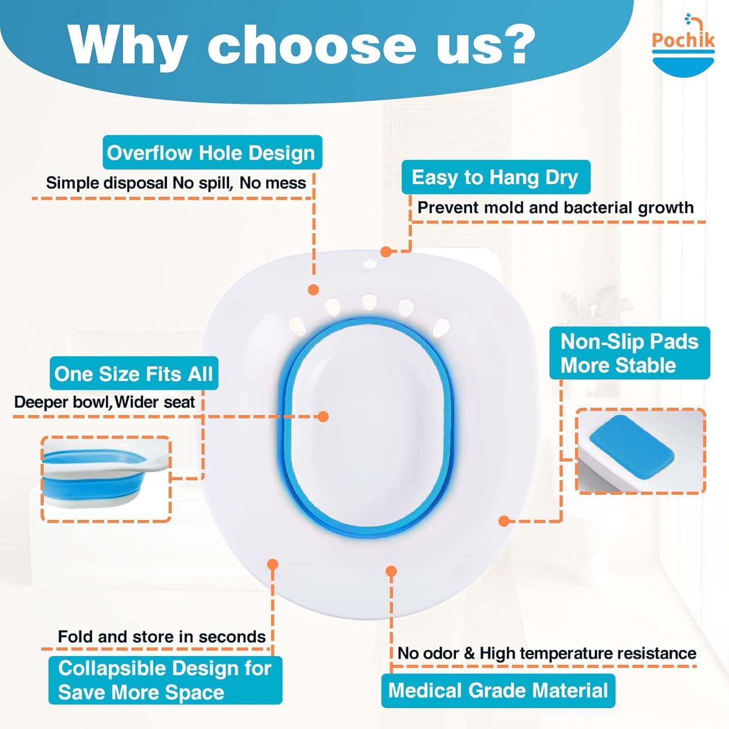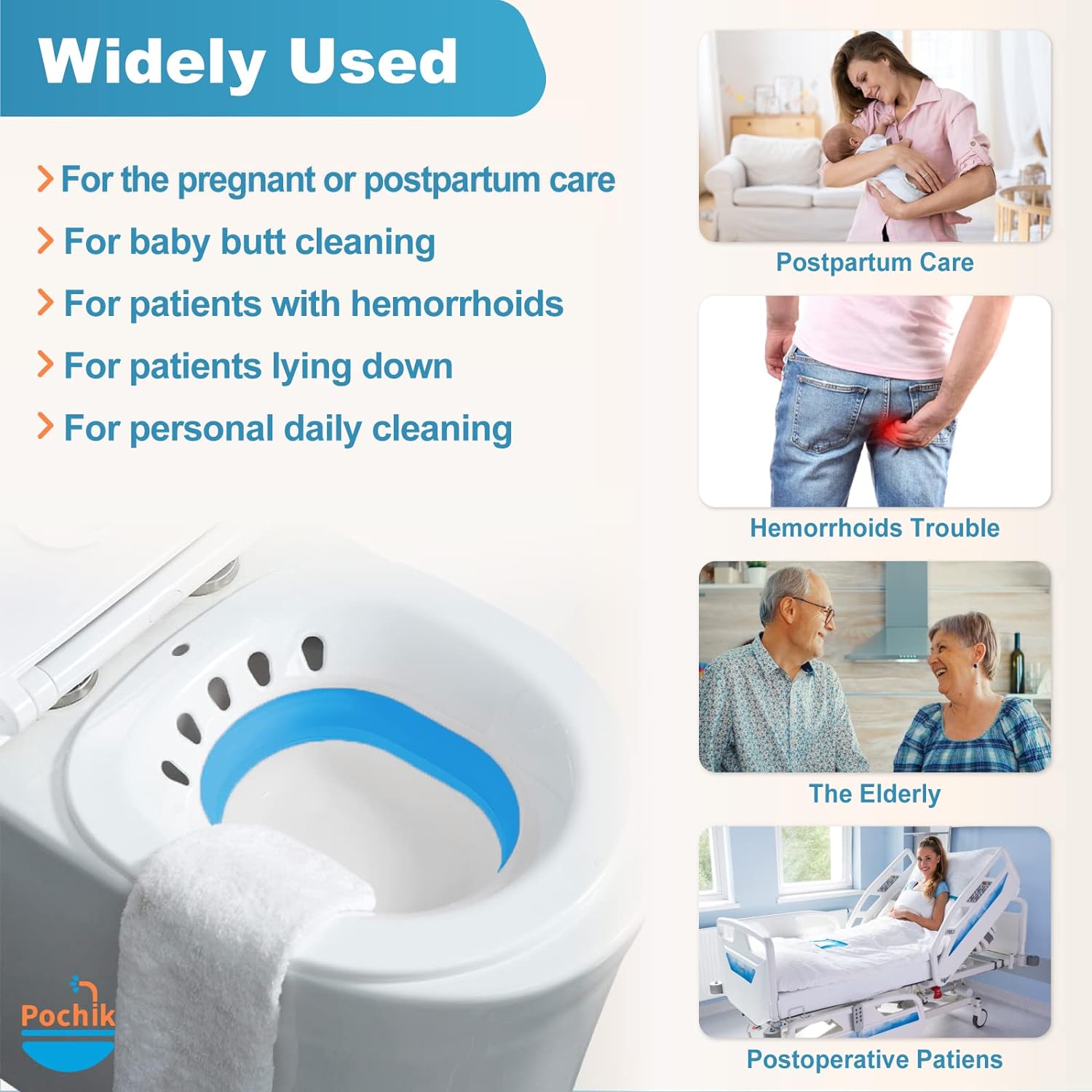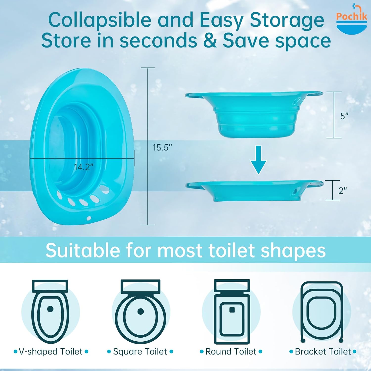 Pochik Sitz Bath, Sitz Bath for Hemorrhoids, Sitz Bath for Toilet Seat, Postpartum Care, Sits Bath Kit for Women, Collapsible, Flusher Hose, Drain Holes, Wider Seating Area, Deeper Bowl