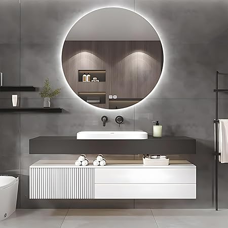 Bathroom Vanity - Floating Bathroom Vanity with Sink & Round LED Defog Mirror with Lights, Modern Bathroom Vanity with Drawer and Floating Shelf, Solid Wood, Wall Mounted(White, 36")