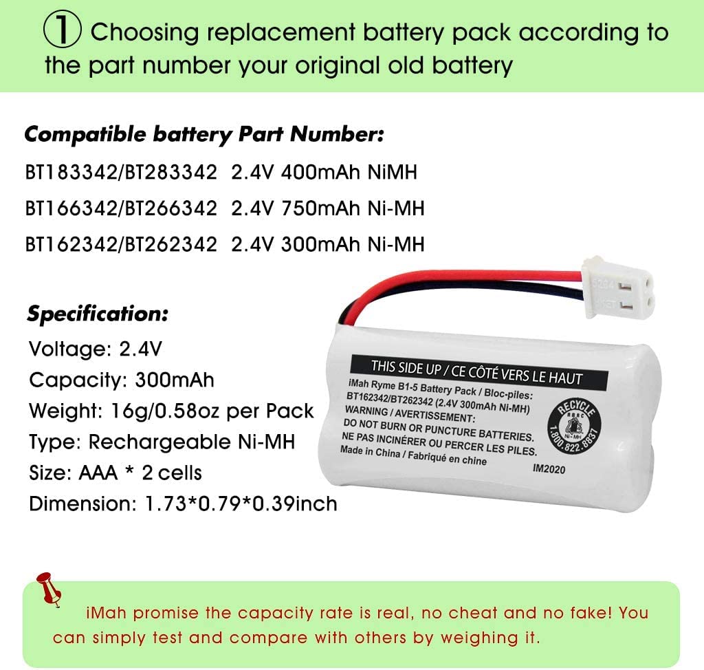 • Over-voltage, over-current, over-charge, short-circuit protection. Best wire length for the space. Come with 2 iMah Ryme B1-5 BT162342/BT262342 2.4V 300mAh Ni-MH battery packs. Save money instead of purchasing new cordless telephone handsets