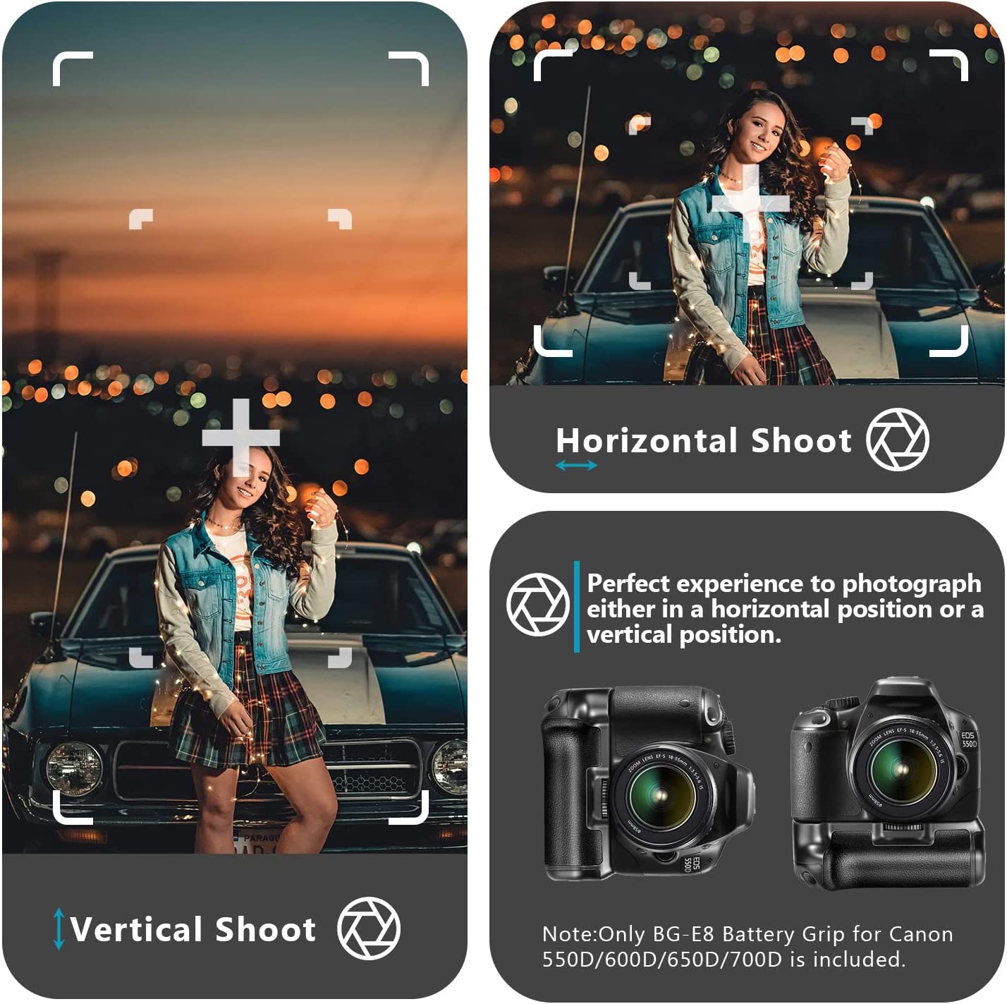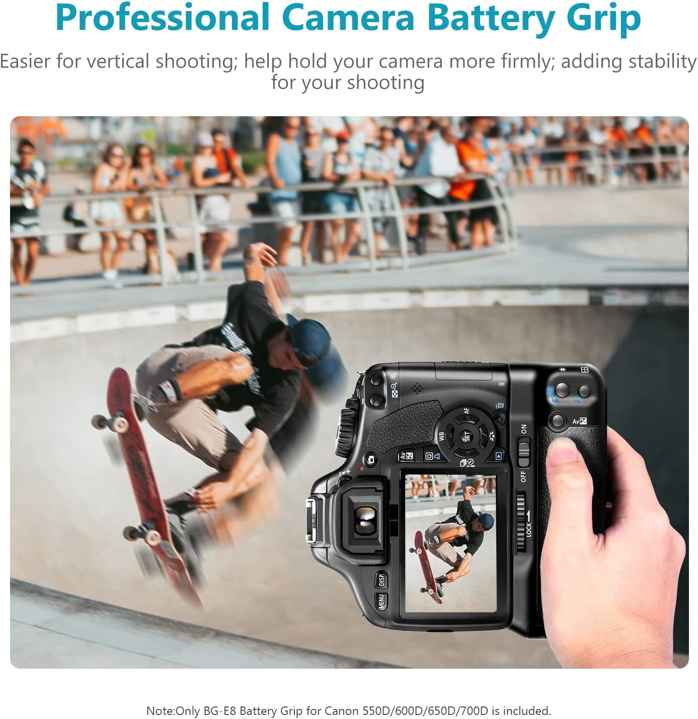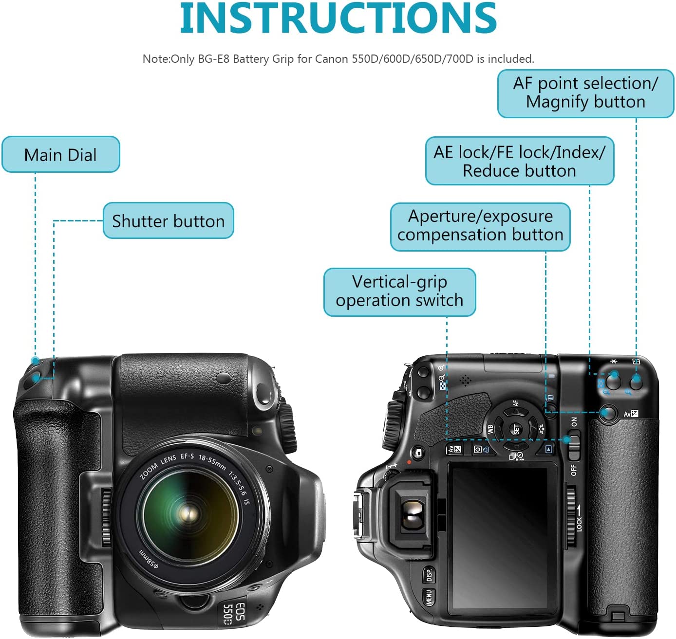 This battery grip/holder is compatible with Canon EOS 550D SLR cameras. It has all the same functions as the original Canon BG-E8 battery grip. The grip has a built in vertical shutter release button, and can hold two LP-E8 lithium-ion battery packs, or six AA batteries using the included battery holder. Additionally, it supports features such as AE lock and FE lock, and retains access to the Index/Reduce button, main dial, AF-Point Select button, and Aperture/Exposure Compensation Buttons. Features: Pro Battery Grip for Canon EOS 550D SLR Camera Hold 6 AA batteries or 2 LP-E8 Li-ion batteries. Vertical shutter with half-press function. More comfortable vertical shooting. Doubling the battery capacity of your camera, effectively extending your shooting time. Professional edition with vertical-grip shutter-release button, main dial, AE-L button, Index/Reduce button and Exposure button. Tripod screw mount. Same functions as the original battery grip Canon BG-E8. High quality product with a big discount from the original one.