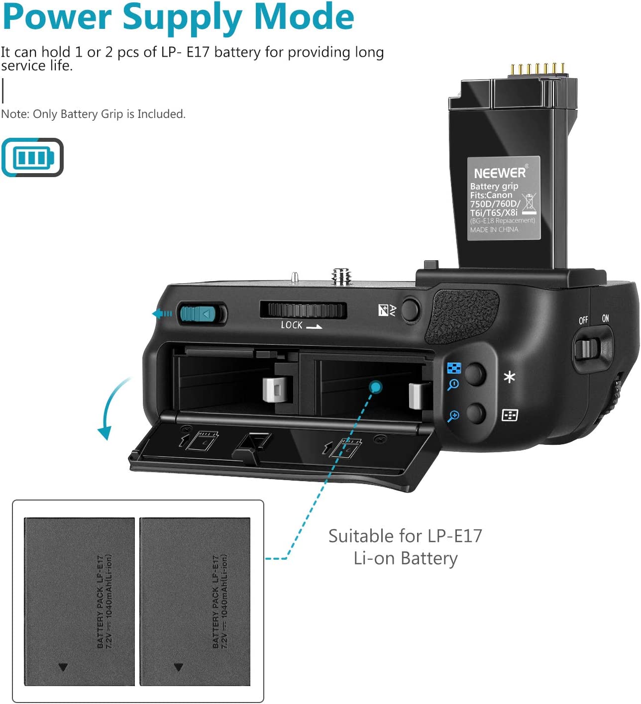 Two LP-E17 Li-ion batteries can be used.(Battery NOT include)