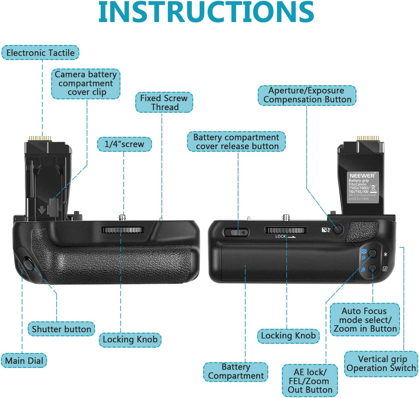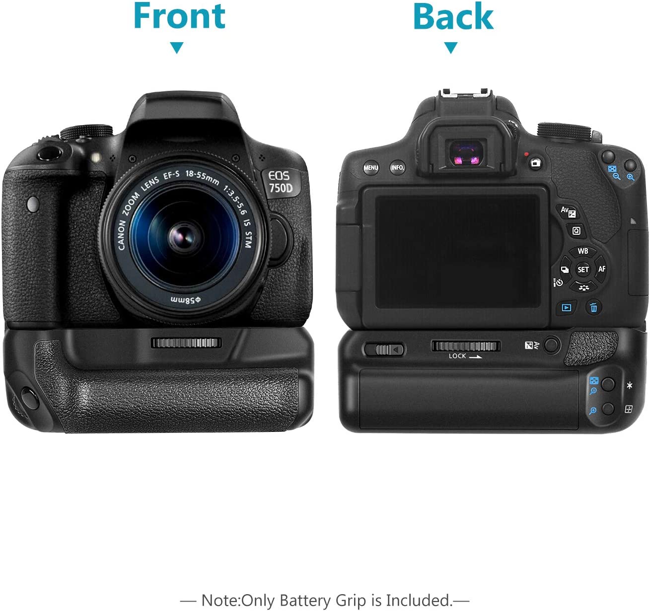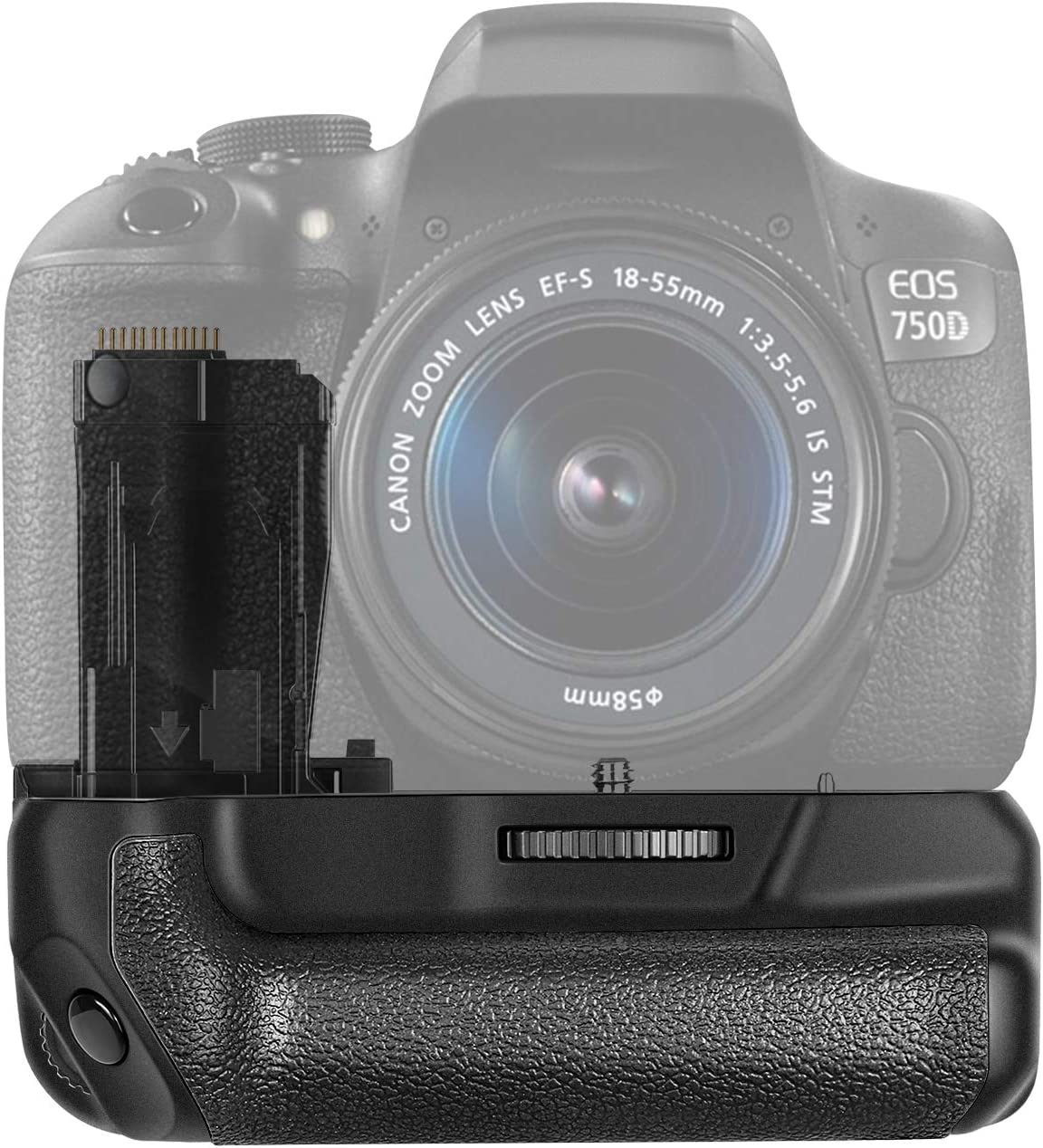 This battery grip/holder is compatible with Canon EOS 750D/760D Rebel T6i/T6s DSLR cameras.