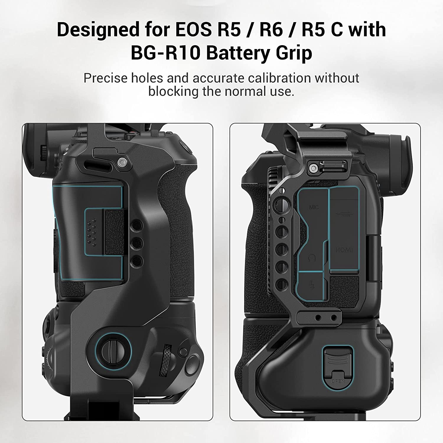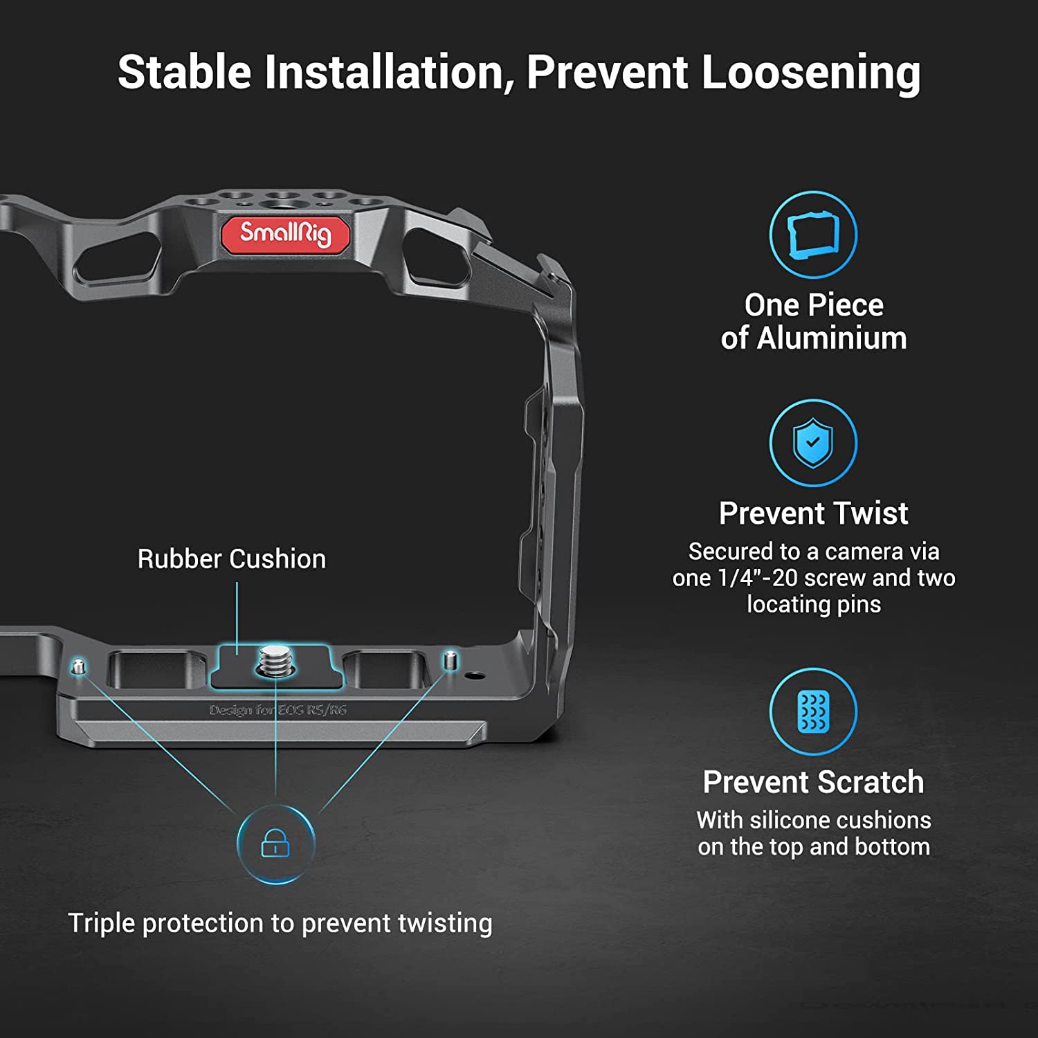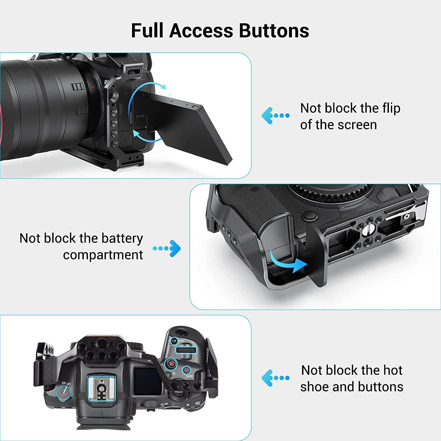 • 【Compact Camera Cage】SmallRig 2982B provides protection for Canon R5 R6 R5 C camera with a wide range of accessories mounting points to make a convenient work of videography . It is secured to a camera via one 1/4"-20 screw and two locating pins with silicone cushions on the top and bottom to prevent scratches