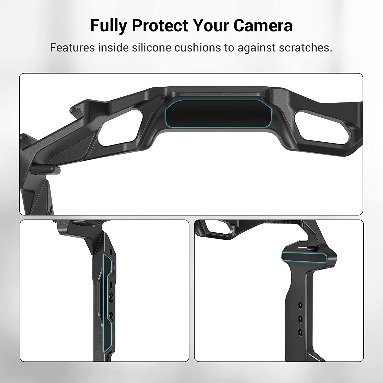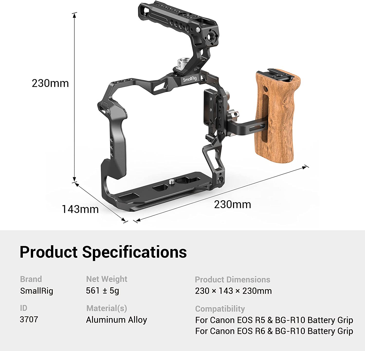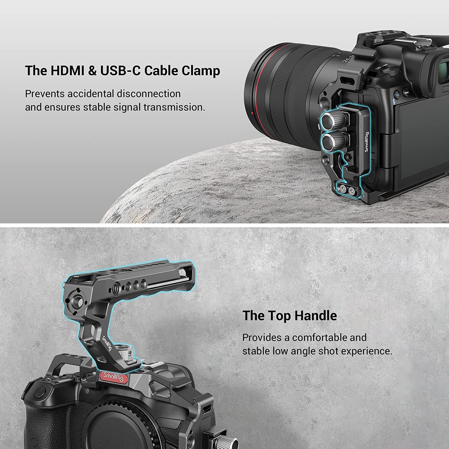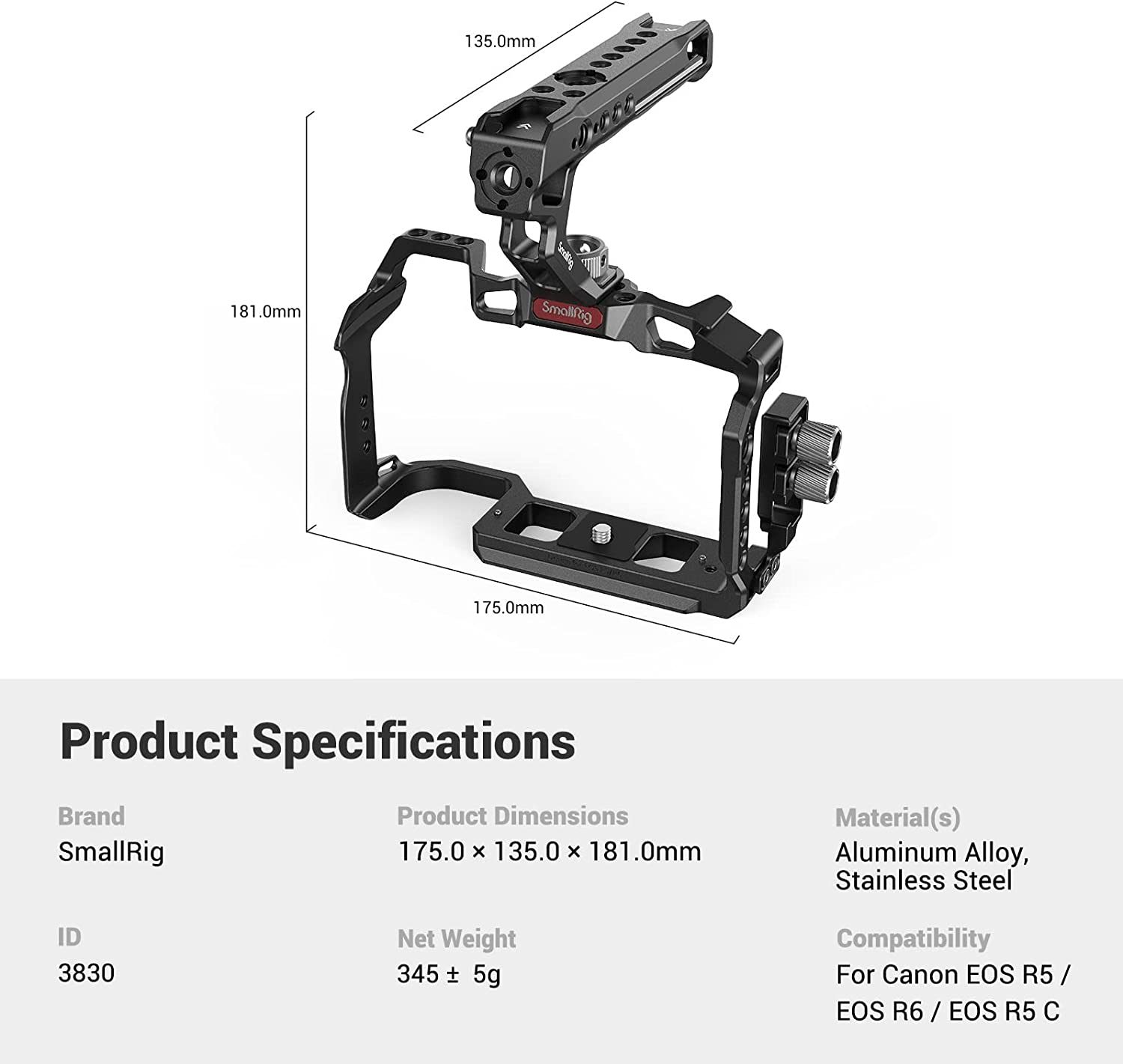 • 【Compact Camera Cage】SmallRig 2982B provides protection for Canon R5 R6 R5 C camera with a wide range of accessories mounting points to make a convenient work of videography . It is secured to a camera via one 1/4"-20 screw and two locating pins with silicone cushions on the top and bottom to prevent scratches
