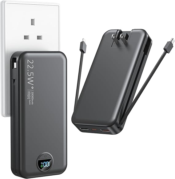 Portable Charger with Wall Plug, 20000mAh USB C Power Bank Fast Charging, External Battery Pack with Built in Cables, Digital Display, 5 Output 2 Input for iPhone Android Cell Phone Tablet