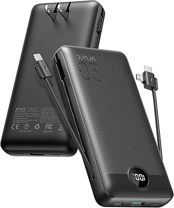 VRURC Portable Charger 20000mAh, Fast Charging Power Bank USB C, 4 Output 2 Input Travel Essentials Charging Bank Equipped with LED Display, Built-in Wall Plug and Cables, Phone Charger Battery, Black