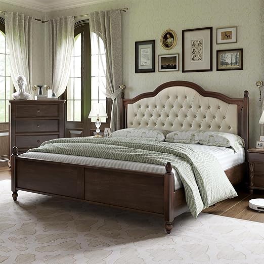 AMERLIFE King Size Solid Wood Bed Frame, Transitional Platform Bed with 52.5" Upholstered Tufted Headboard, Rubberwood/Roman Column Accents/Wood Slat Support/No Box Spring Needed