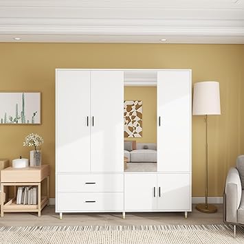 4-Door White Wardrobe Closet with Mirror, 2 Drawers White Armoire Wardrobe Closet with Doors, Bedroom Armoire with Hanging Rod, 63" Wx20.4 Dx70.9 H