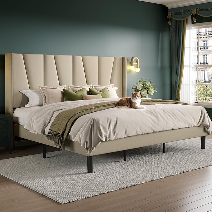 Allewie King Size Platform Bed Frame with Geometric Wingback Headboard, Modern Upholstered Bed with Wooden Slats Support, No Box Spring Needed, Easy Assembly, Beige