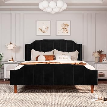 Allewie Queen Size Velvet Bed Frame Upholstered Platform Bed with Vertical Headboard and Footboard, Solid Wood Leg and Strong Slats Support, No Box Spring Needed, Easy Assembly, Black