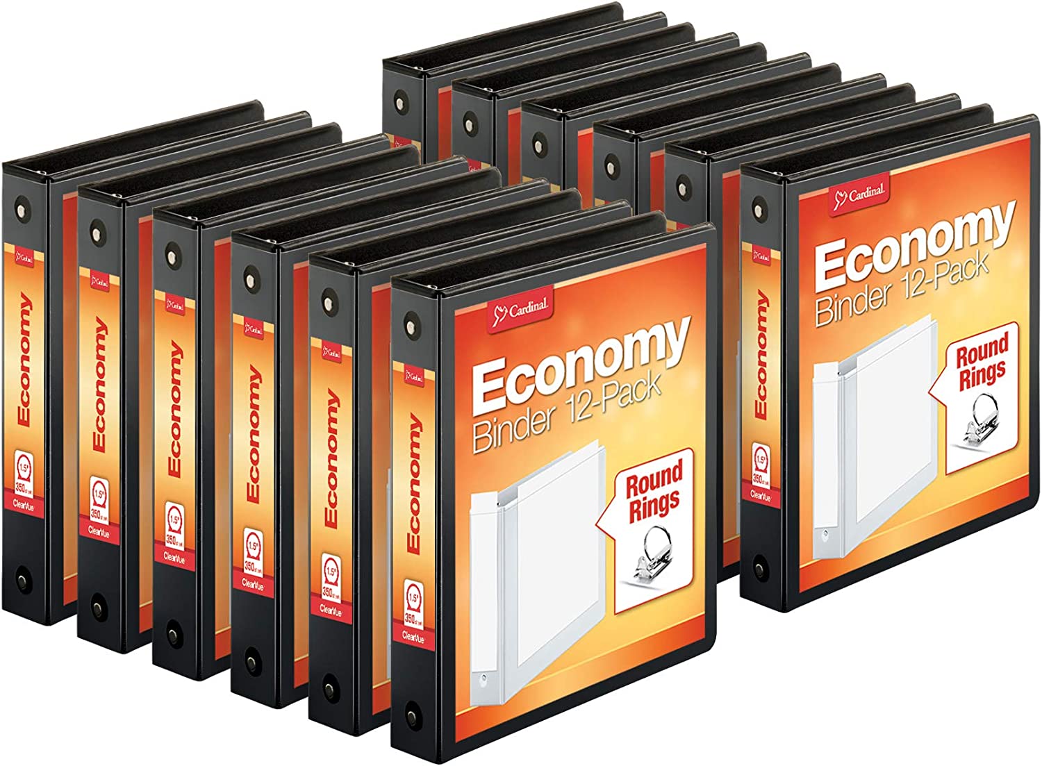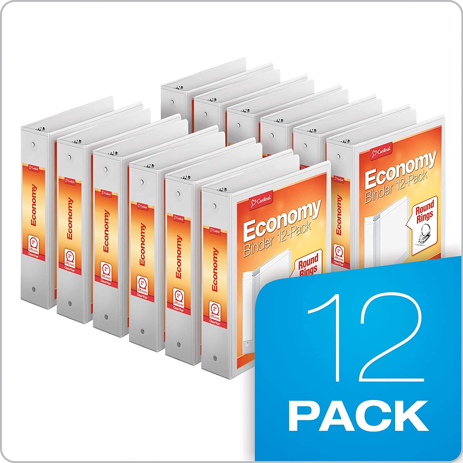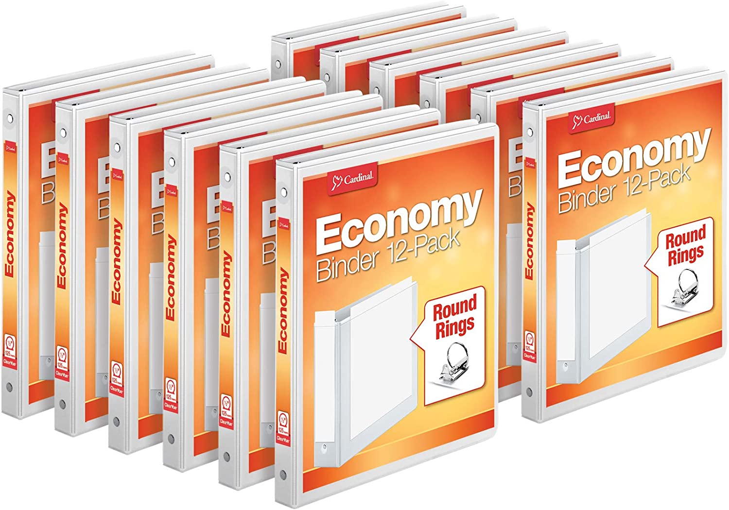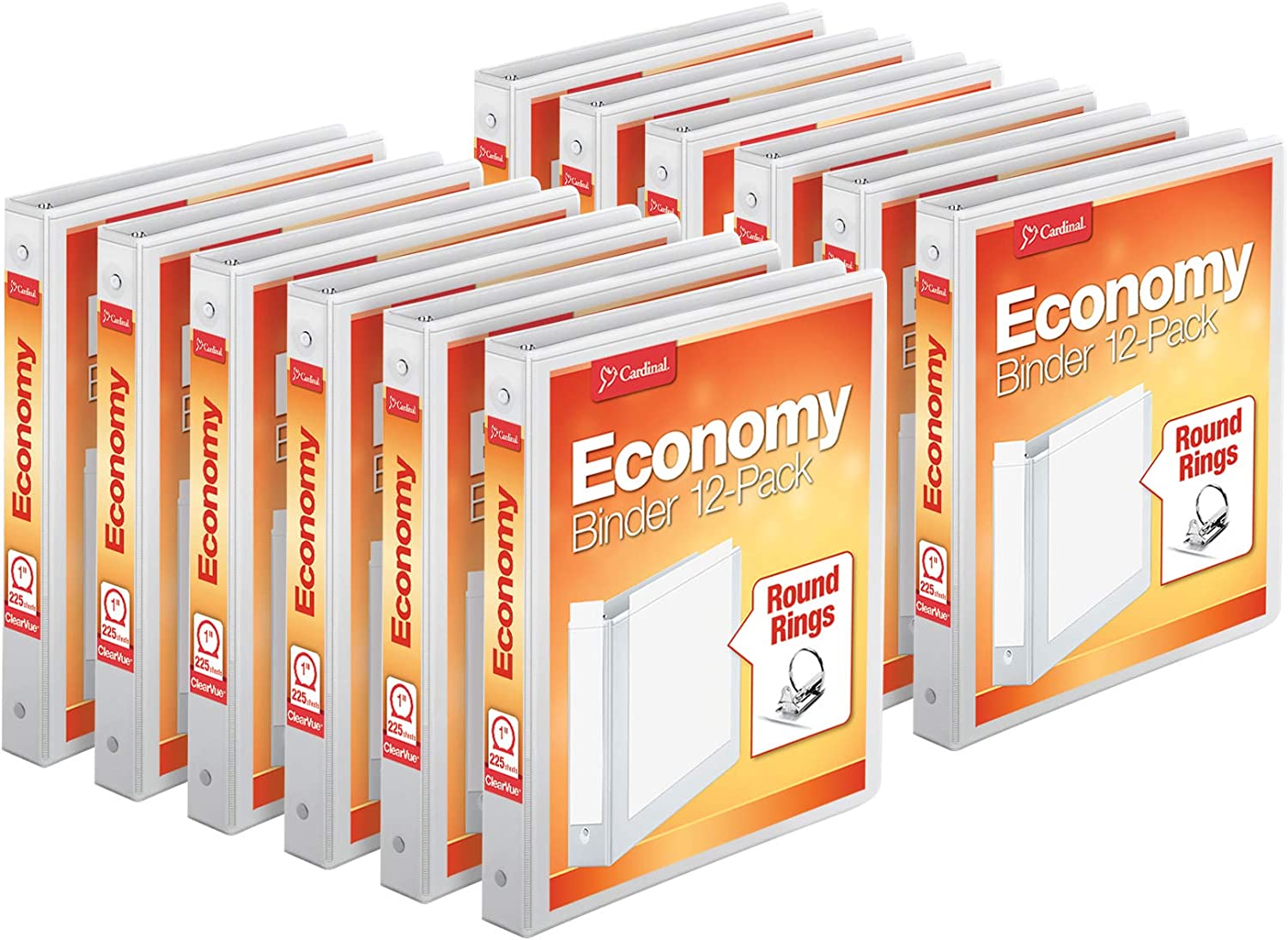 Cardinal Economy 3-ring binders are now available in bulk packs of 12 so you can quickly and easily stock up for the office. These ClearVue presentation binders each have a customizable front, back and spine so what's inside is organized and easy to find. 1". Holds 225 sheets. White. Round rings. Carton of 12. durable hinge: A unique XtraLife hinge helps prevent tearing along cover seams. customizable covers: identify what you need quickly or create a unique look for presentations, proposals and more. extra storage: Each binder has two clear interior pockets for extra unpunched paperwork. recycled content: cover boards made from 100% recycled fiber with at least 98% post-consumer fiber.