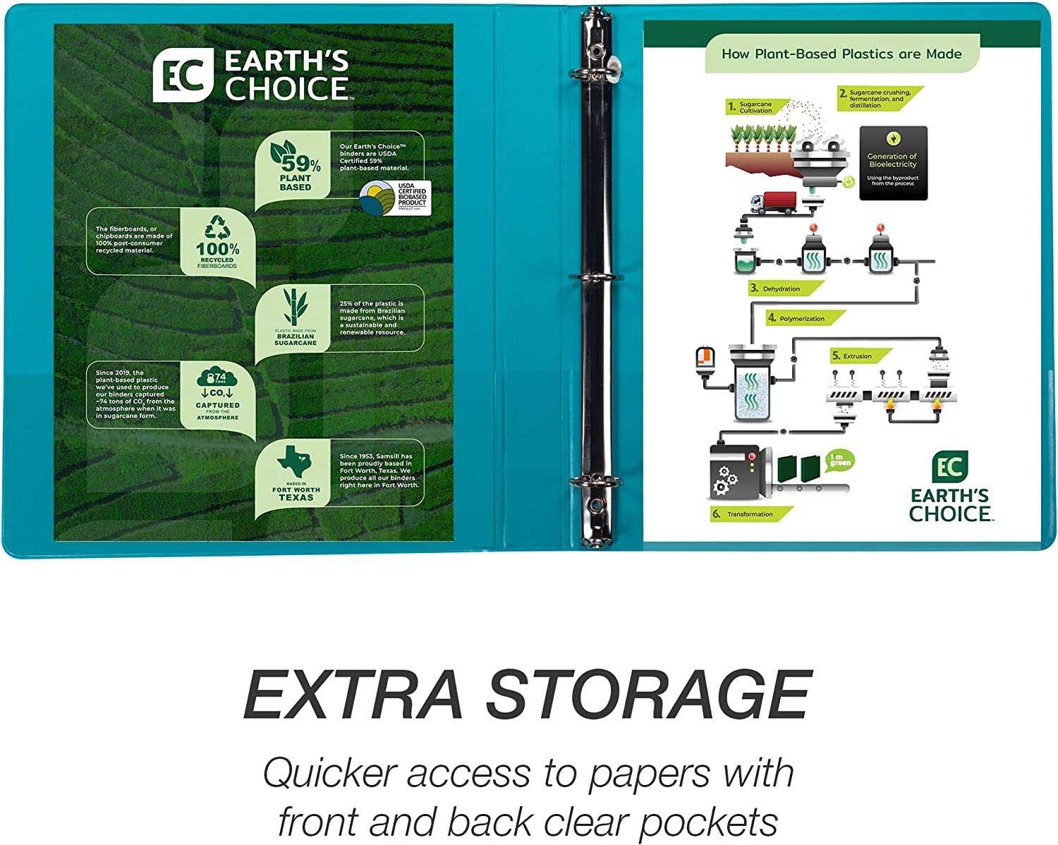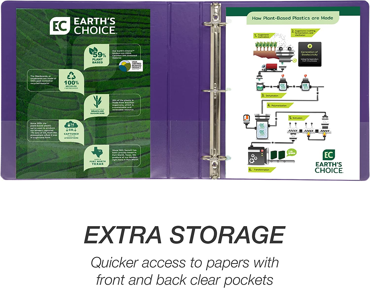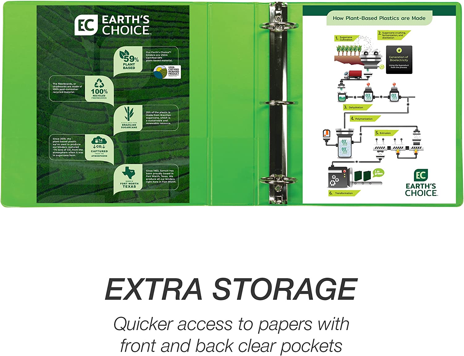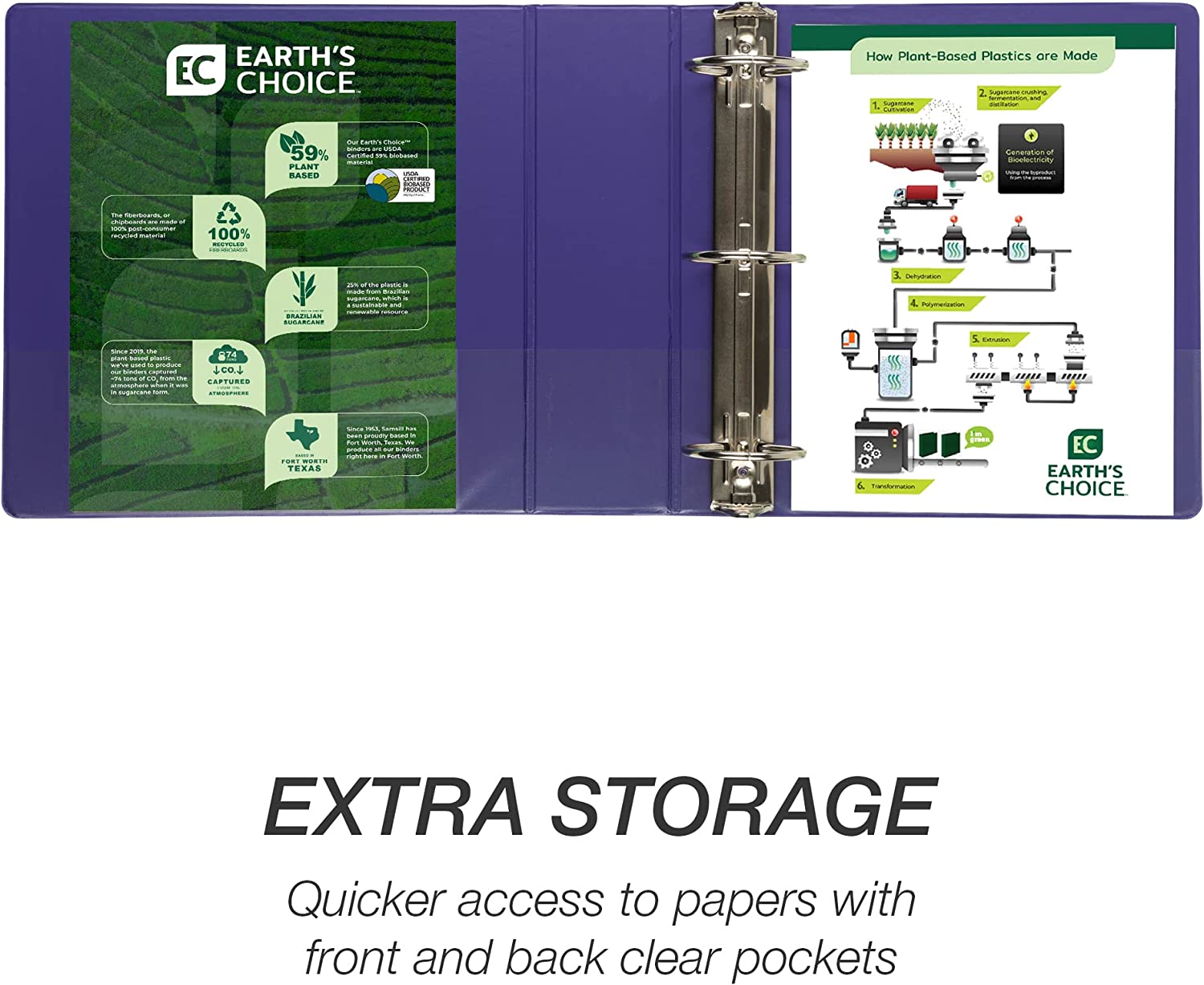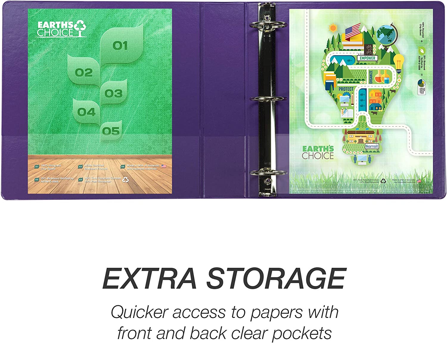 Our three ring binders make indispensable home, office, and school supplies. While there are many binders available, only our plant-based 3 ring binder 2-inch binder set offers the sustainable organization you've been searching for. These binders are made with at least 59% plant-based material and come with a cover made with up to 25% plant-based renewable plastic. The durable chipboard is made from 100% recycled material and a minimum of 98% post-consumer content. Plant-based content is carefully tested using ASTM D-6866 standards. Each important document binder features a clear overlay along the front, back, and spine, allowing you to customize your presentations, projects, and more. A non-stick polypropylene cover adds durability and effectively prevents the transfer of ink or lifting of copy when materials are inserted into the cover or placed inside. The rings are mounted on the back lid, allowing pages to lay flat while also preventing wear and tear on documents. Two clear interior pockets provide additional storage with enough space for notes, photos, business cards, or full-size pages. Get crafty and create a baseball card binder, portfolio binder, recipe binder, trading card binder, savings binder, etc. The possibilities are endless!