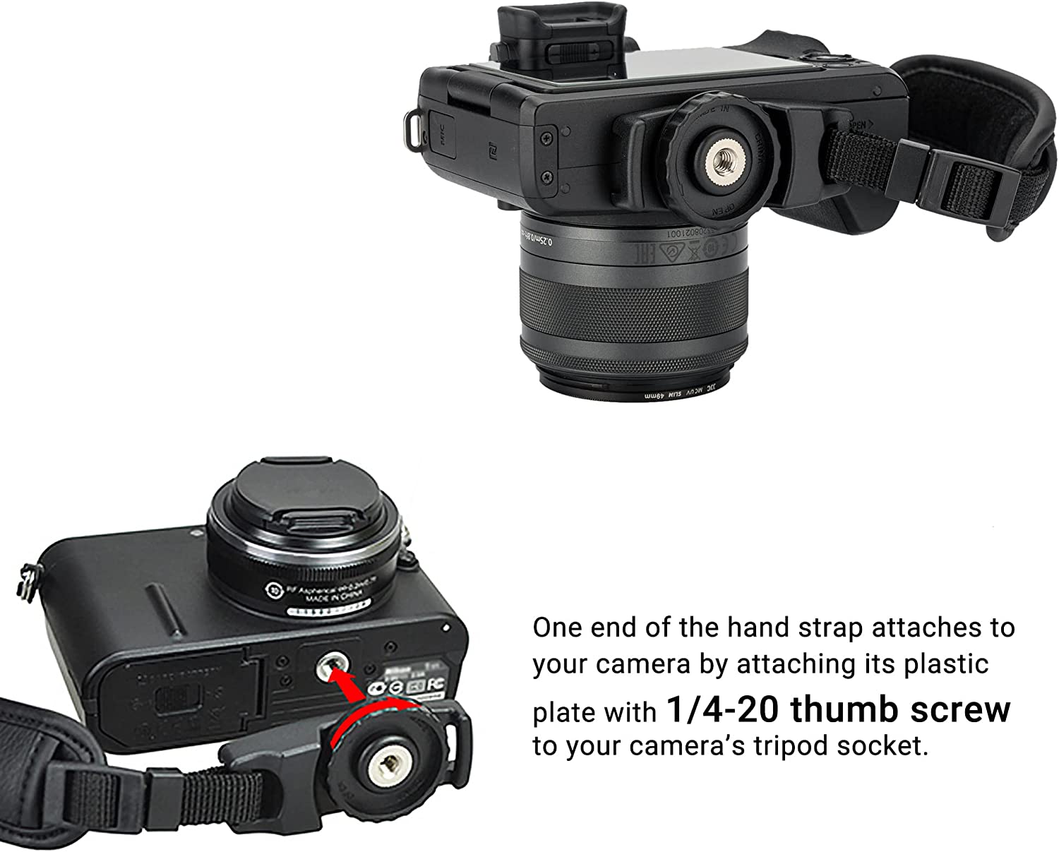 • 【With 1/4"-20 Mount】: The thumb screw plate is also designed with a 1/4''-20 tripod socket, allowing you to mount your camera onto a tripod without removing the strap when necessary.beside, there is a strap eyelet for attaching a neck strap on the other side while this hand strap is attached.