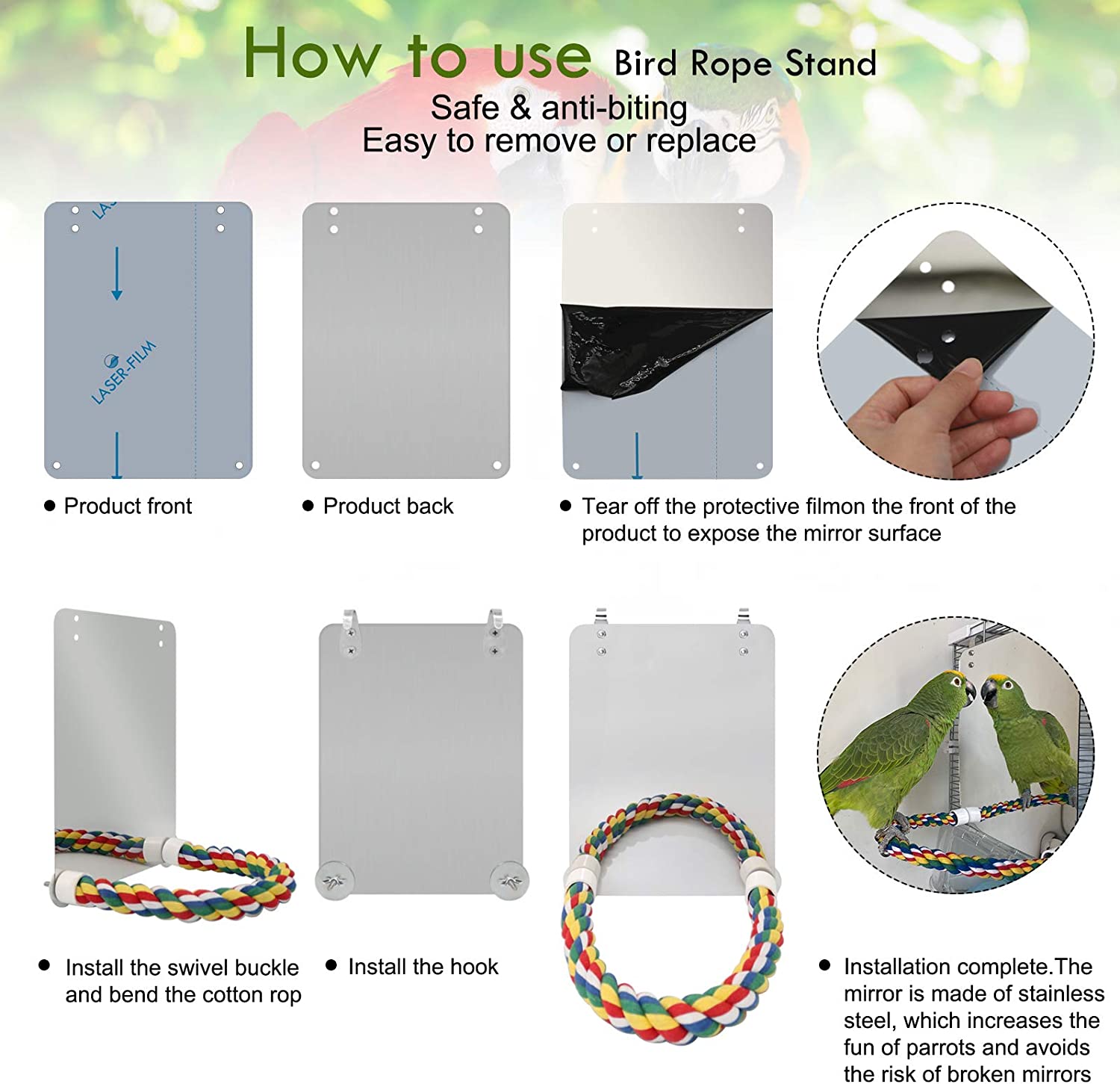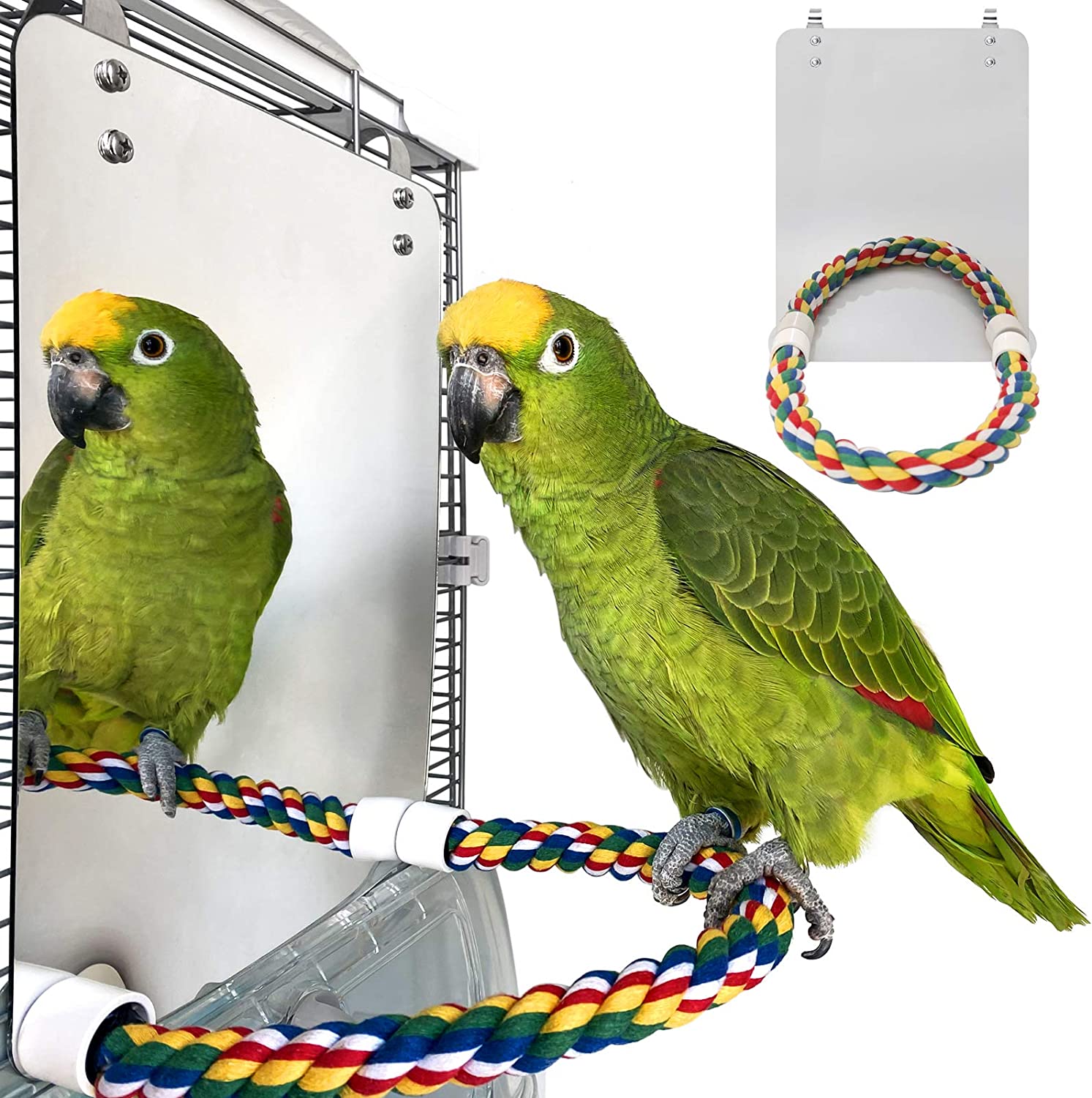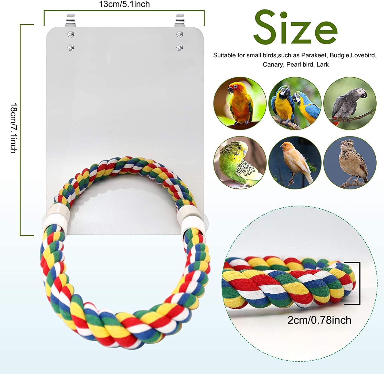 • GIVE BEST GIFT TO BIRD--- Pet bird rope perch with Mirror,perfect decoration for your bird cage.Ideal for birds to exercise, Entertained while developing balance and coordination skills.