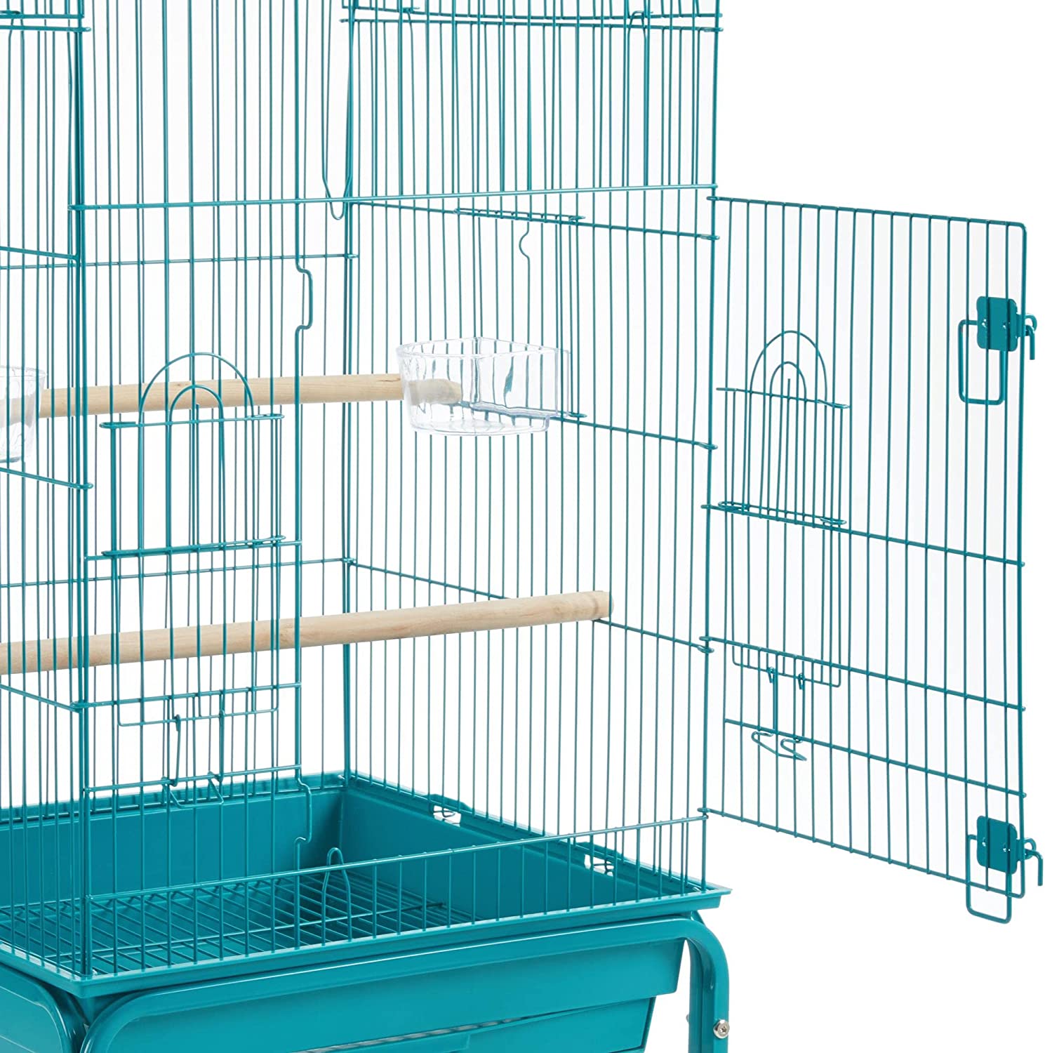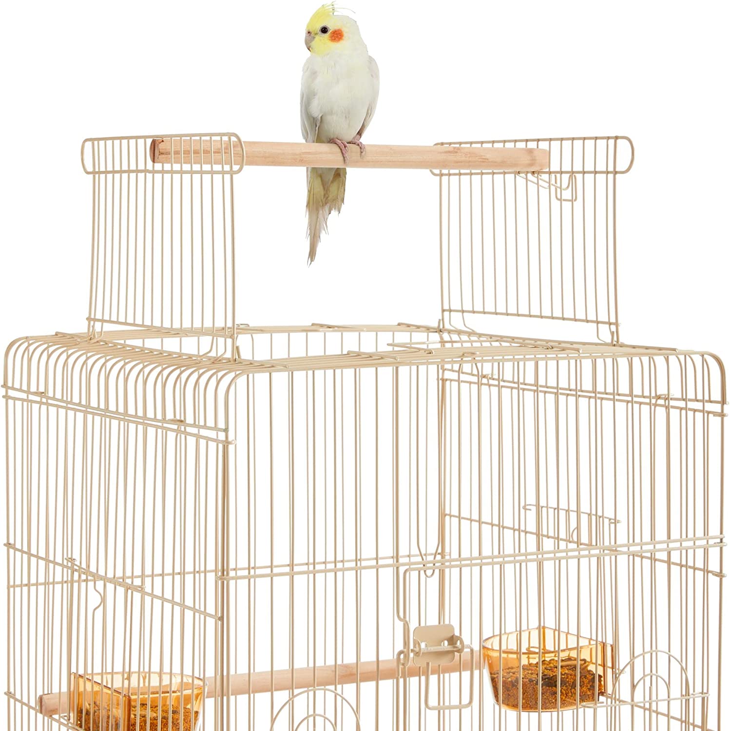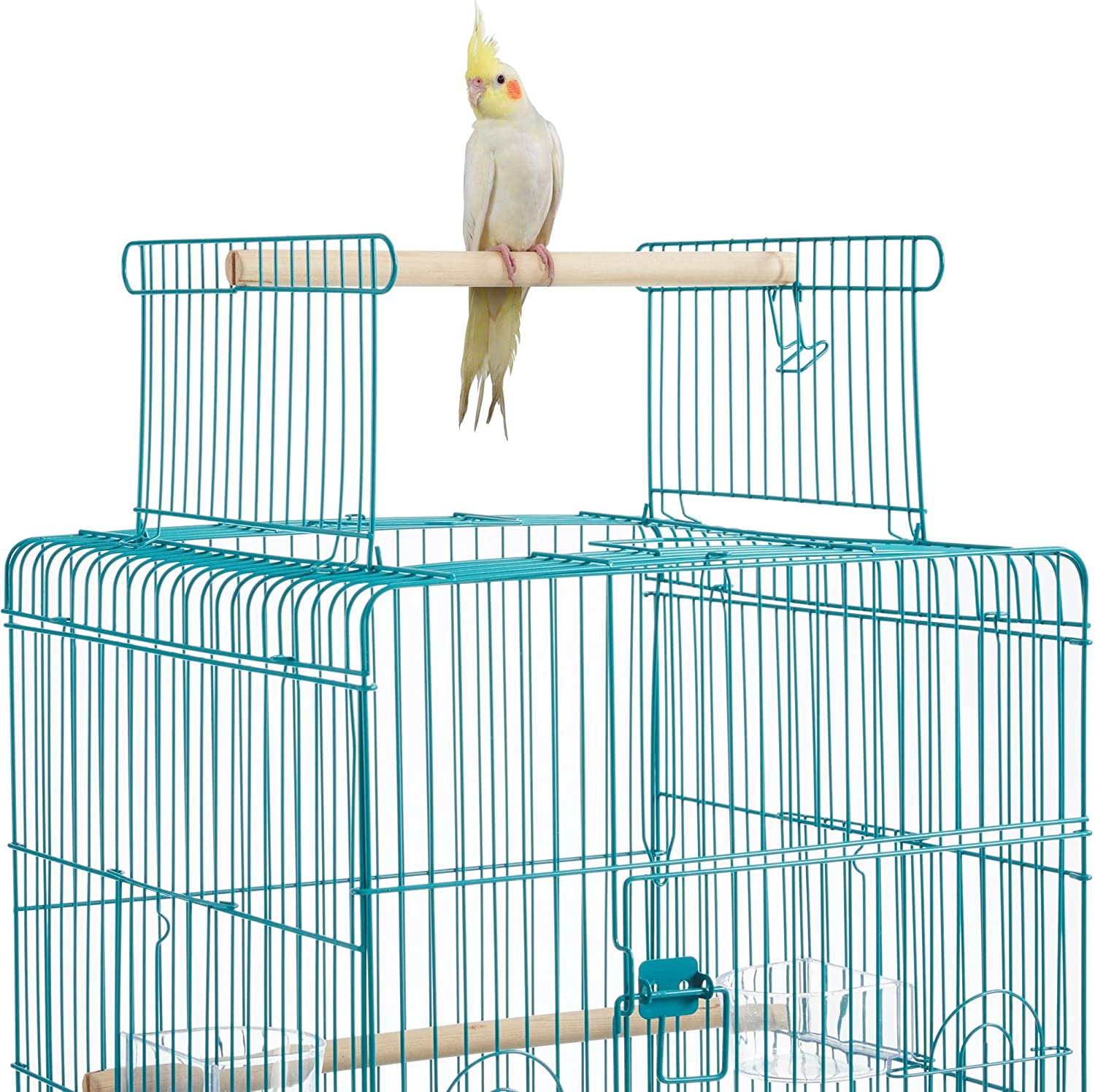 • 【CONVENIENT FEEDING SYSTEM】: On the facade of this rolling bird cage are two feeding cups that can be accessed outside the cage through the small feeding doors. This convenient design helps easy bird seed refilling without disturbing your easily-scared friends.