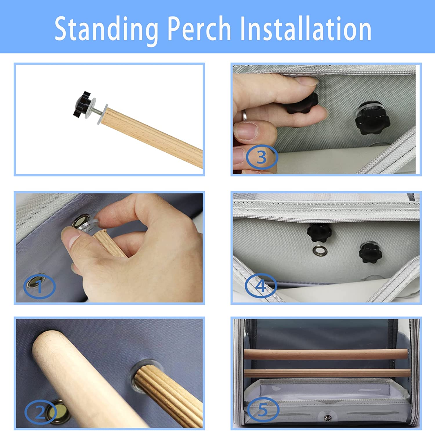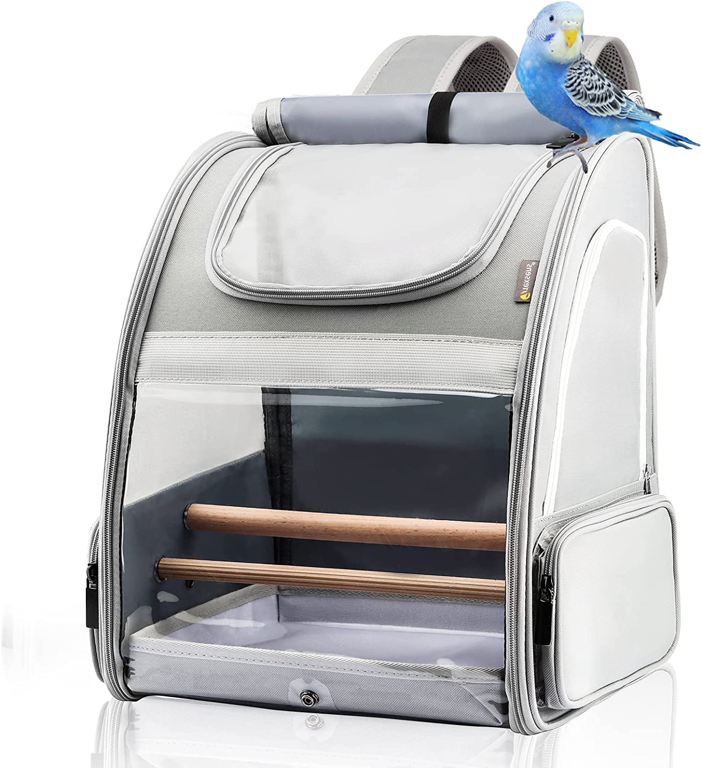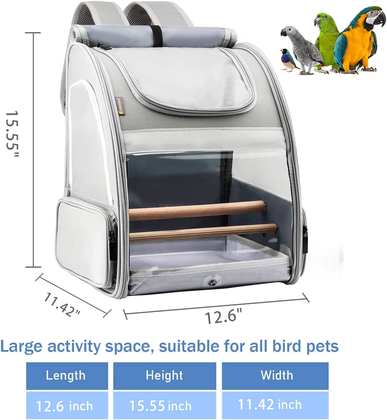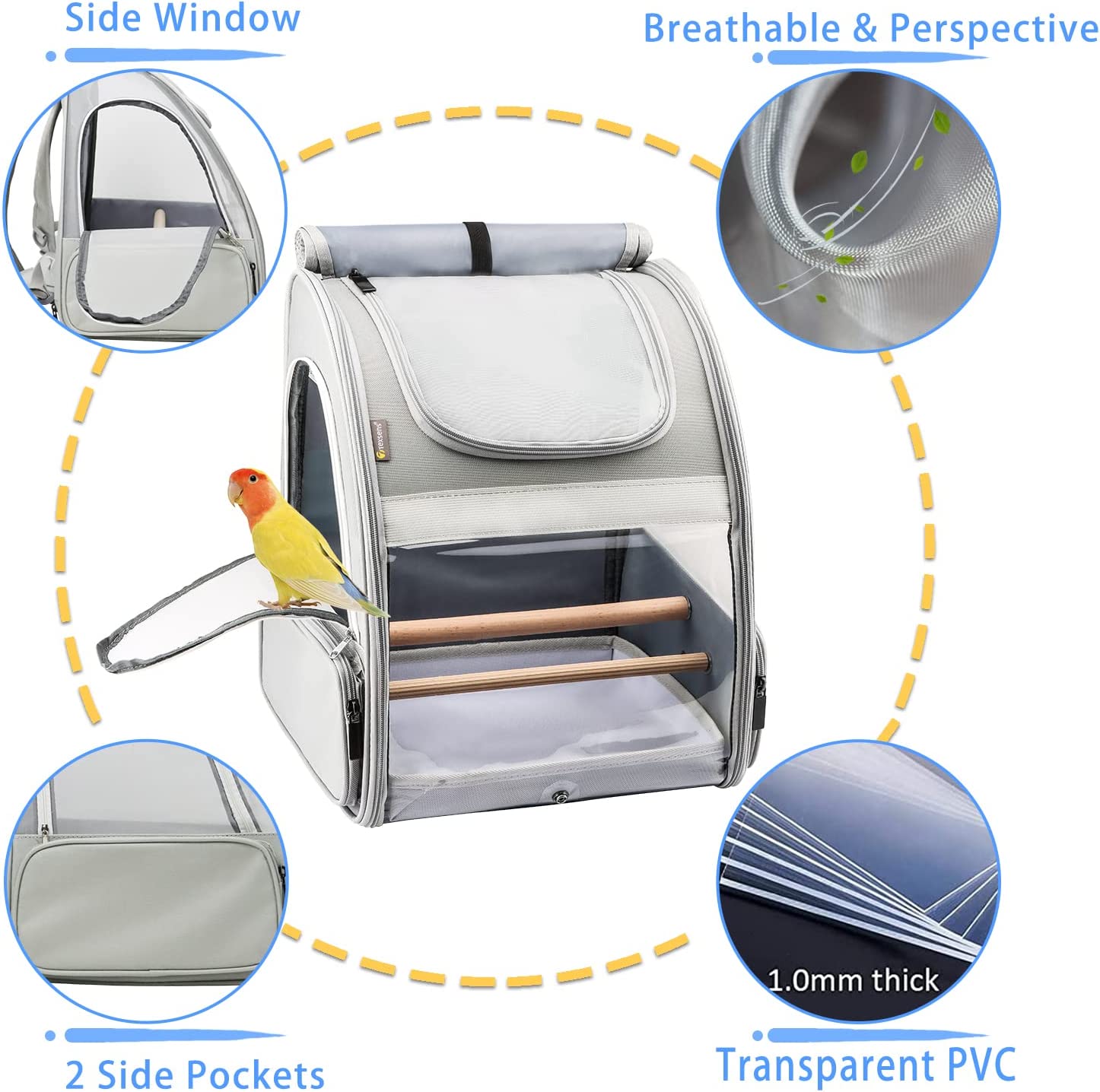 PORTABLE BIRD TRAVEL CARRIER - Size of parrot cage 12.6"x 11.42" x 15.55"(32*29*39.5cm), Size of the standing perch: 12.6" x 1", Size of the tray: 12.2" x 8.3". Please check the product dimensions and measure your pet before buying. BREATHABLE, WIDE VIEW & SHADING - Both sides of bird carrier are anti-bite and wear-resistant large mesh areas for great ventilation and optimal airflow, and the front is a transparent window for great scenery view while travel and hiking.Extra fabric shade to cover entire front backpack gives better privacy and blocks UV light and strong sun while hiking. EXTRA DESIGN - Extra side entrance allows your birds to get in and out better, and you can also slip the zipper to amuse your birds. Added Side Pockets can put your pet bird’s toys and food, as well as your personal belongings. SECURE & STEADY - Added WASHERS at both ends of the standing perch to make the perch not easy to rotate, more steady and secure, will not make your little friends fall off. There are 2 holes on each side of the backpack to place perch as needed. FREE UP YOUR HANDS - This bird carrier is portable by the top soft handle, also backpacking by the padded double-strap with secured chest buckle for outdoor. Suggested for Conures, Cockatiels, Quakers, Caciques, Mini Macaws, Small Cockatoos, Lories, and other similar size parrots. Unscrew the nuts on both sides and remove the perch, also can be used as a daily pet backpack for cats, dogs and other pets.