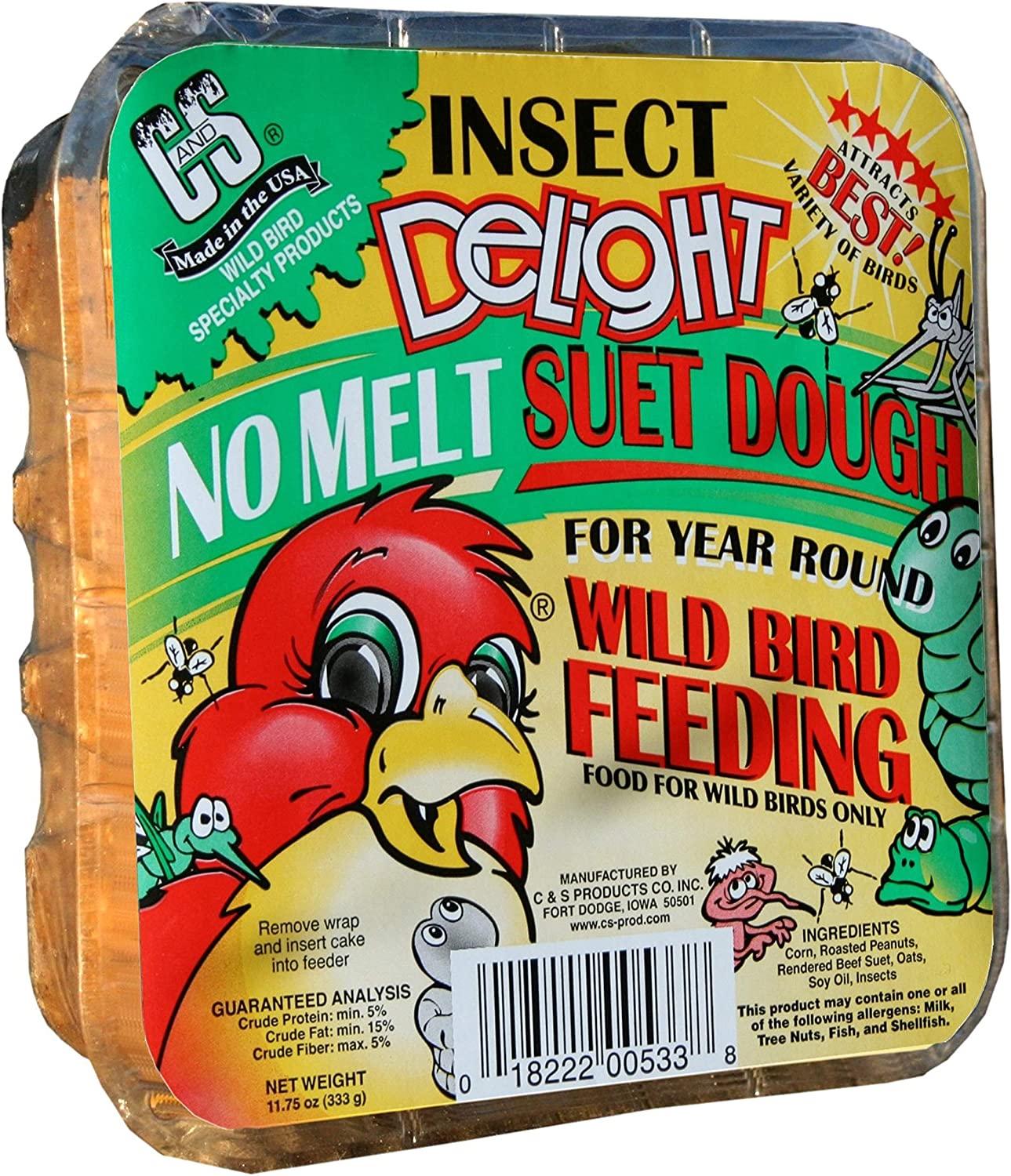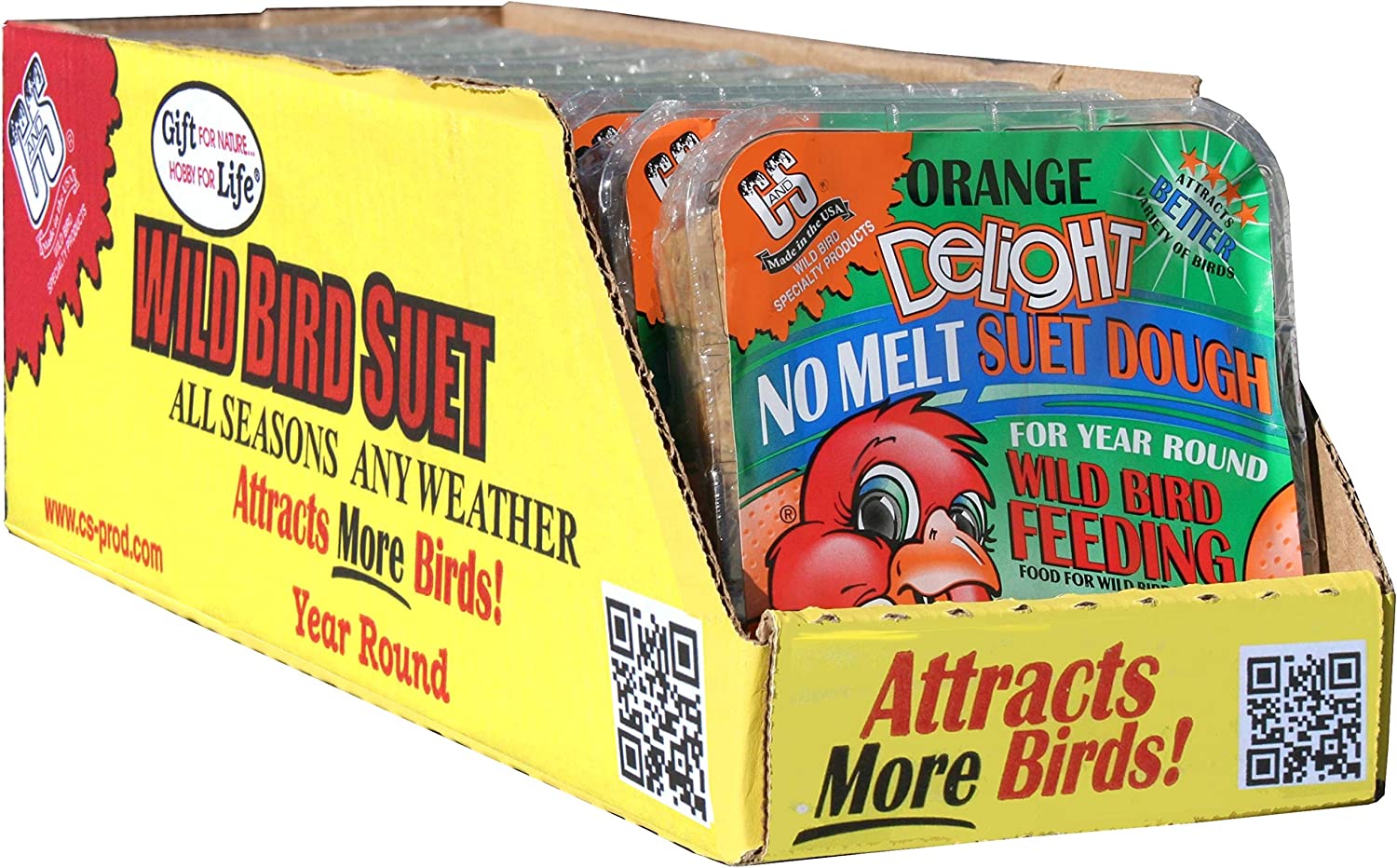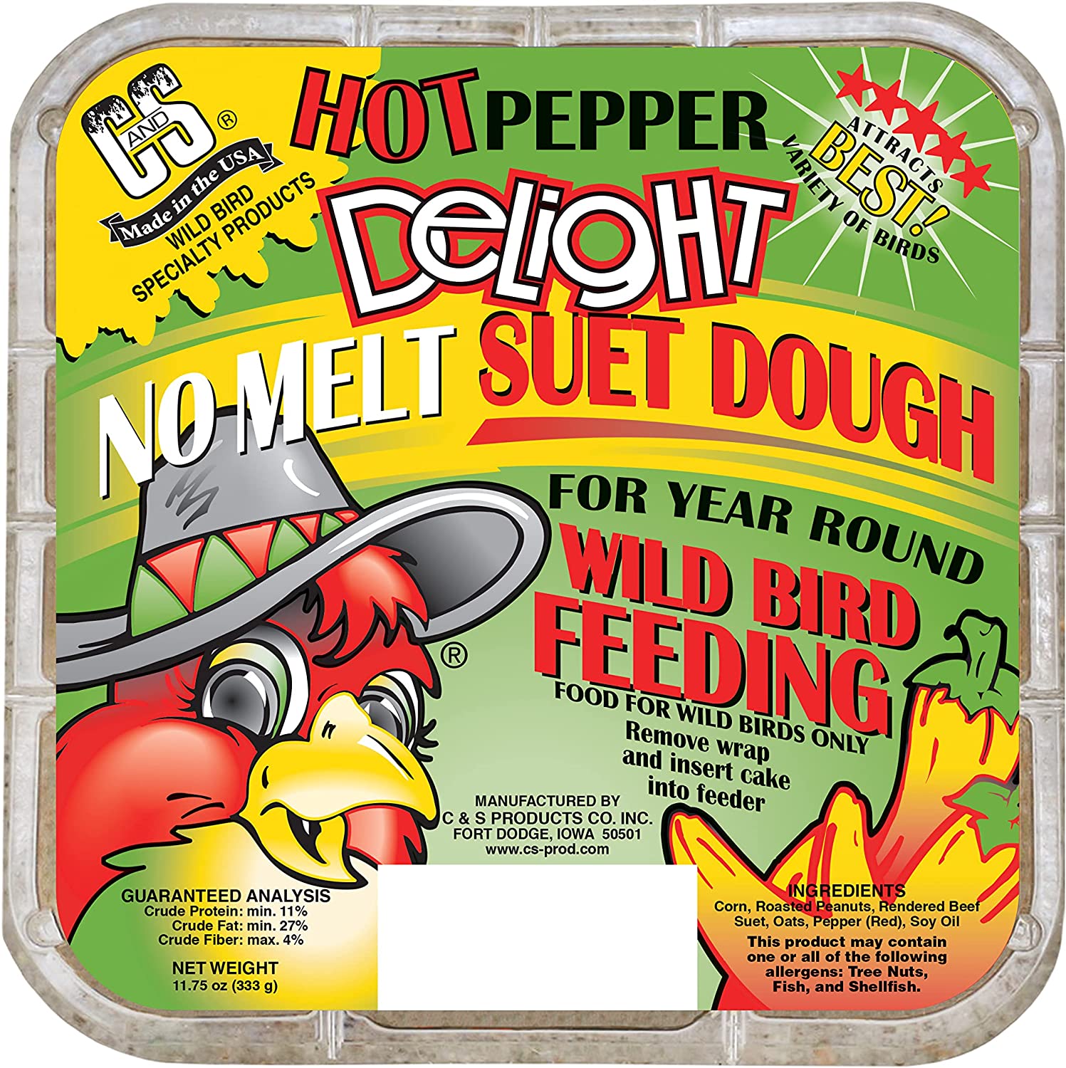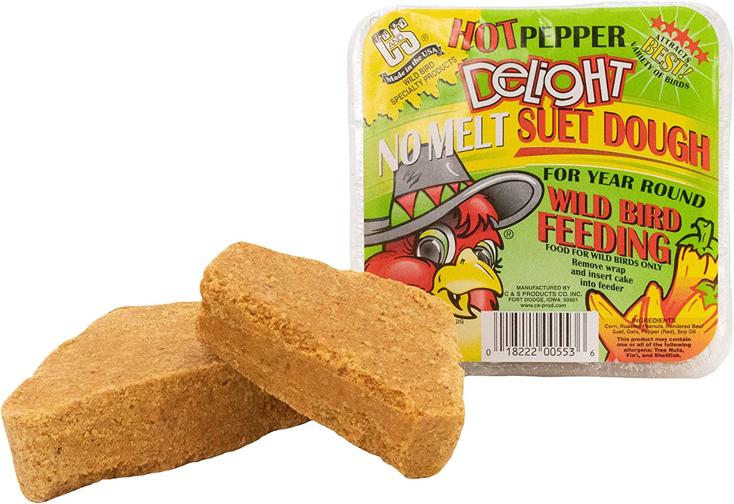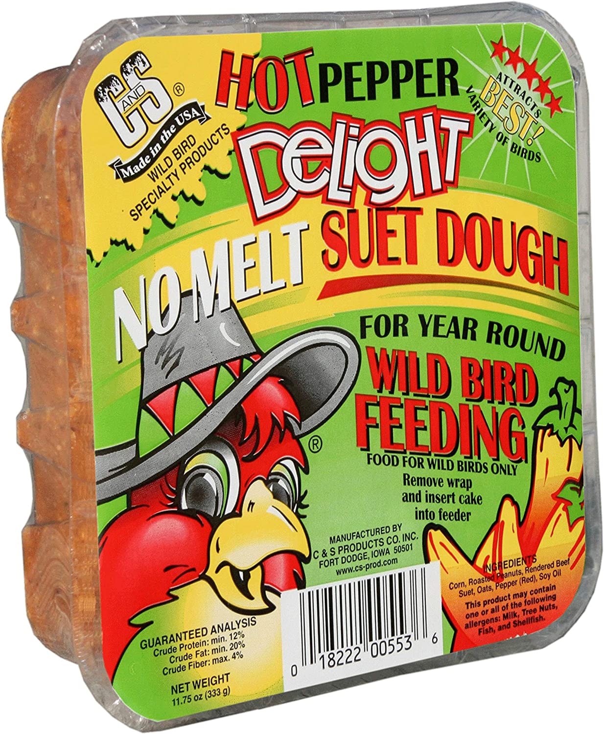 Hot Pepper Delight is blending the same high quality beef fat with a base of corn meal and roasted peanuts. Other ingredients are added and mixed into a soft dough texture and then pressed into a cake form. C&S's process, unlike others who pour their dough products into a tray, creates the only true no melt suet product line in the world. This produces products unmatched in the industry for year round feeding in all types of weather. Attracts the best variety of birds.C&S Products Company is the leader in the Wild Bird Suet Market. Since our founding in 1986, C&S Wild Bird Feeding products and accessories have achieved unprecedented levels of customer satisfaction and loyalty. We take pride in our reputation of creating the highest quality products! We have a great team of employees that take pride in what they do every single day. We promise to continue to offer our customers products that give the best value and bird loving results!