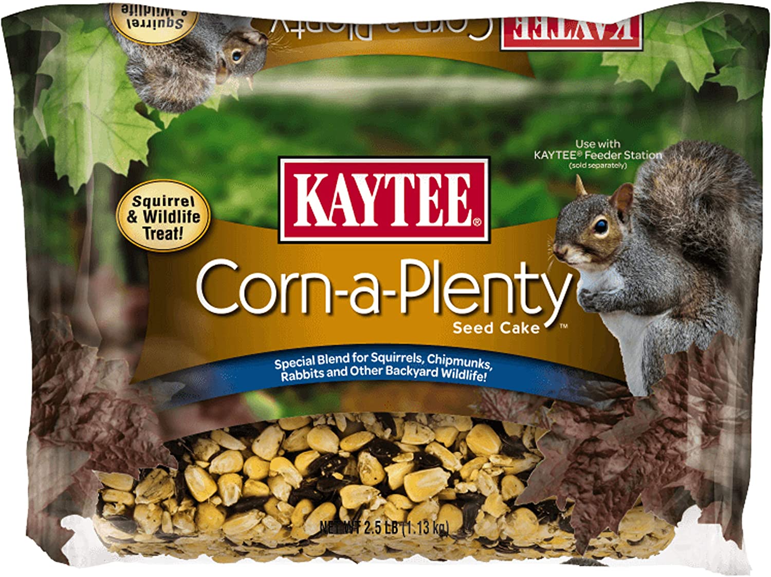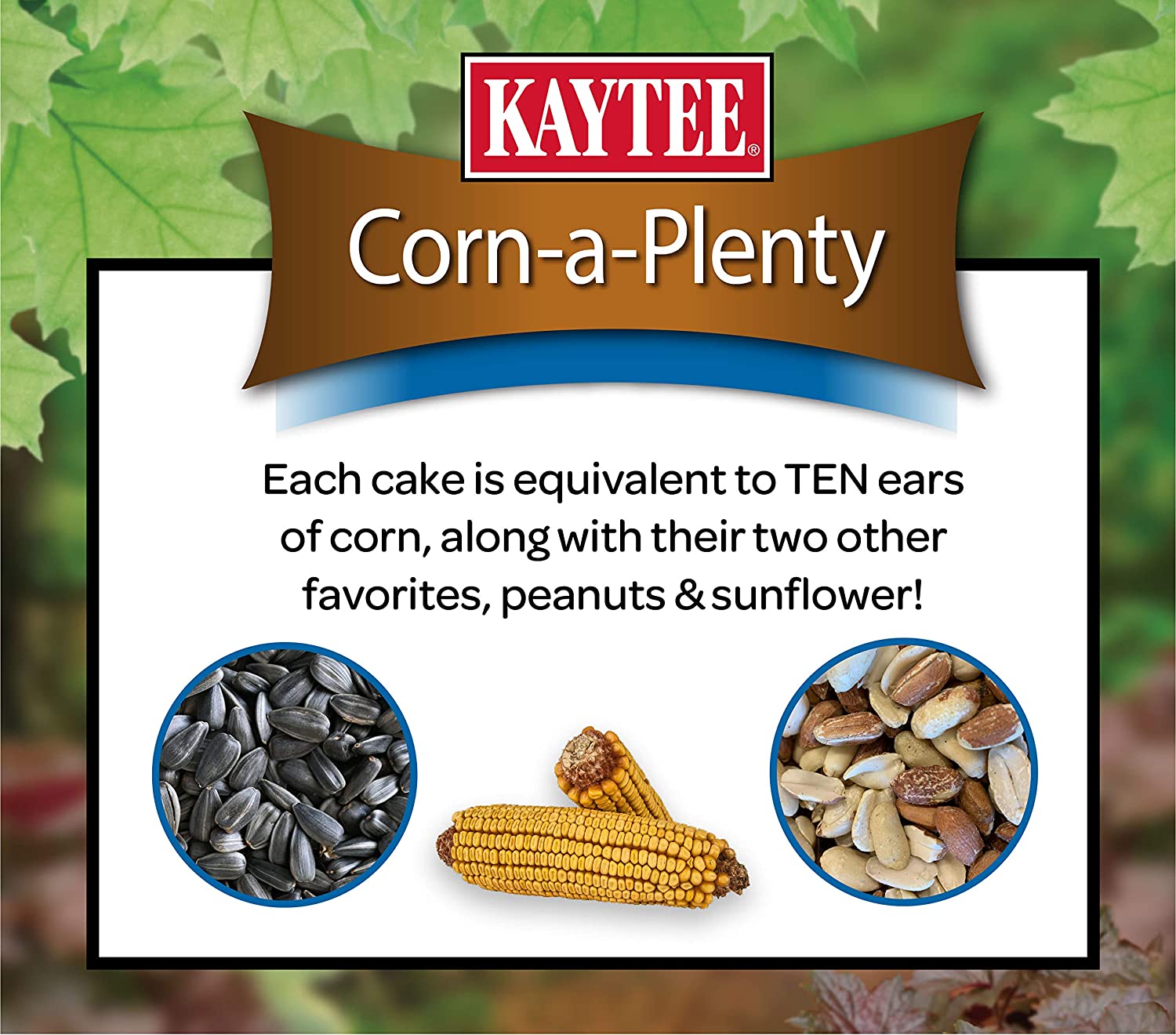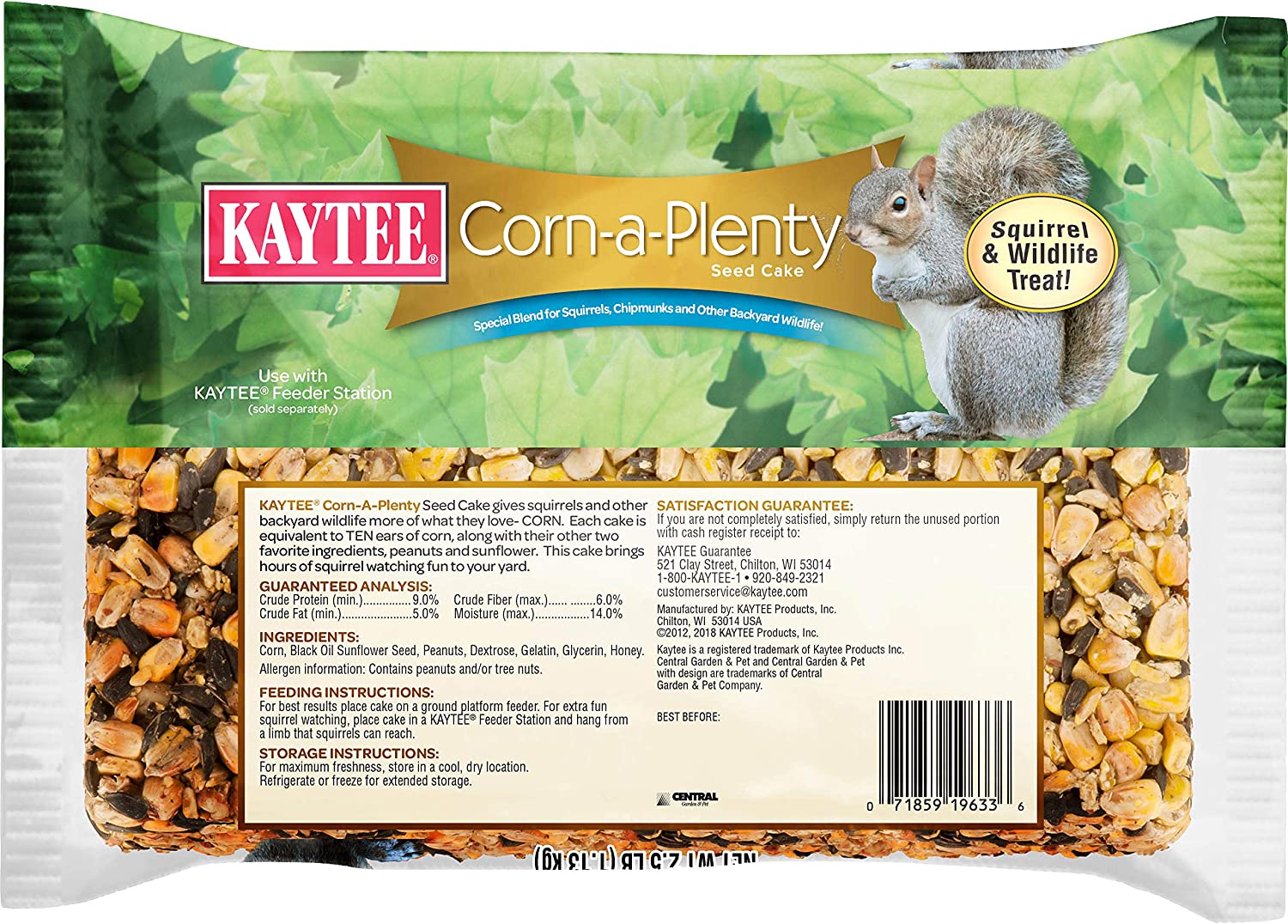 Kaytee Corn-A-Plenty Squirrel & Wildlife Cake gives squirrels and other backyard wildlife more of what they love- CORN! Made with a special honey, seed and grain formula, this Corn-A-Plenty cake is sure to be a hit with your backyard friends. Feeding Instructions: Keep feeders filled with fresh food. Discard old food before refilling and clean feeders regularly to minimize mold and bacteria. This product is only intended for feeding wild birds. Storage Instructions: Reseal package and store in a cool dry place, preferably in a sealed container. This will protect against insect infestation that can naturally occur with any whole grain seed product.