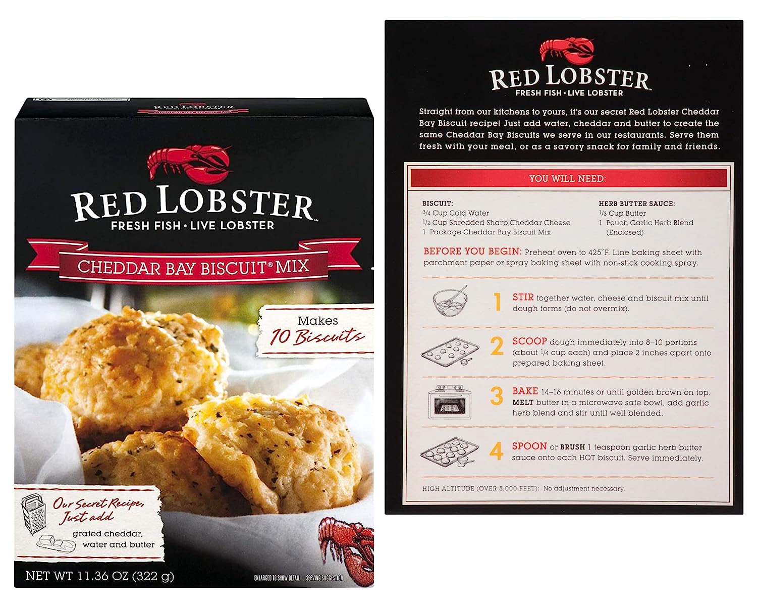 • Create your favorite Cheddar Biscuits in a snap with this Red Lobster Biscuit Mix! Just add water, cheddar and butter to create the same cheddar biscuits served in Red Lobster restaurants.