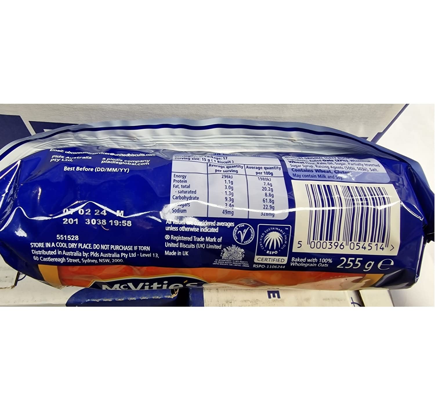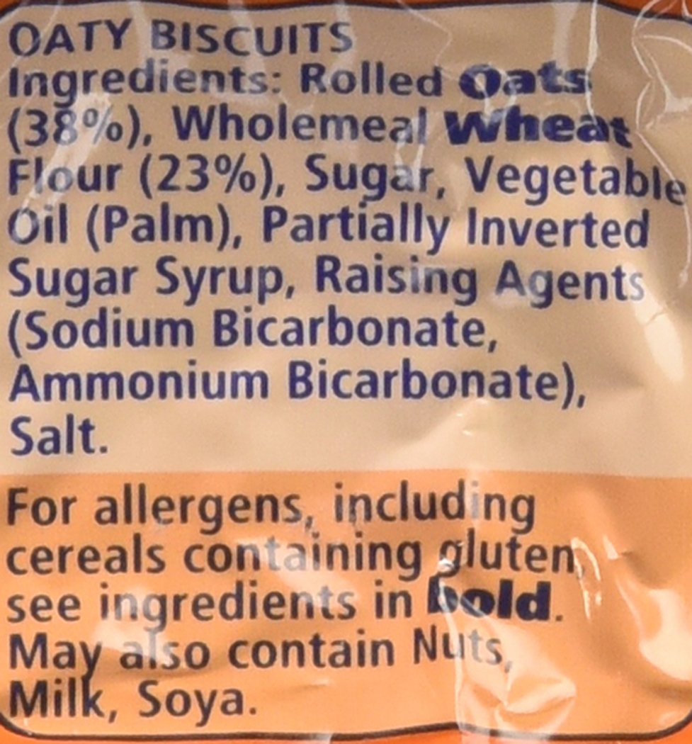 The original oaty biscuit with no chocolate topping. McVities Hobnobs are set apart from the rest because they are crunchy at first, and then melt in your mouth to create a wonderful taste sensation. One nibble and your nobbled! Ingredients: Rolled OATS (38%), Wholemeal WHEAT Flour (23%), Sugar, Vegetable Oil (Palm), Partially Inverted Sugar Syrup, Raising Agents (Sodium Bicarbonate, Ammonium Bicarbonate), Salt.