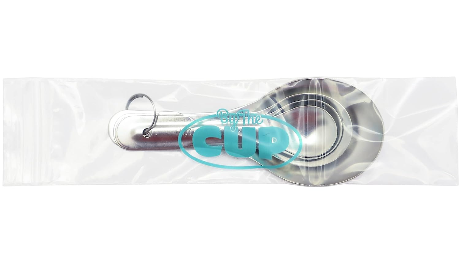 By The Cup Measuring Spoons includes 4-pieces with 1/4 tsp, 1/2 tsp, 1 tsp, & 1 Tbsp capacities. Spoons held together with metal ring. Thin stackable design makes spoons easy to store. Accurately measures ingredients. Made of stainless steel.