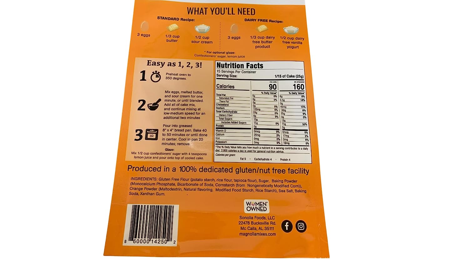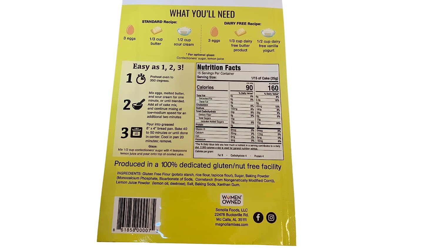 Have you gone gluten free, but miss that delicious, sweet, succulent taste of pound cake? Well look no further! Magnolia Mixes' Gluten-Free Lemon Pound Cake Mix is a premium gluten-free baking mix made of a custom blend of nutritious gluten free flours designed to produce an old fashioned, delicious Lemon Pound Cake. It's easy to make - just add 3 ingredients! It's moist and light, not crumbly like so many 'other' gluten free mixes. It's so good, nobody at the table will believe it's gluten free! Each of our batches is gluten-tested to 10 parts per million (PPM) - compared to the standard 20 PPM, so you can rest assured you'll be giving yourself, your family, and friends safe, delicious gluten-free baked goods!