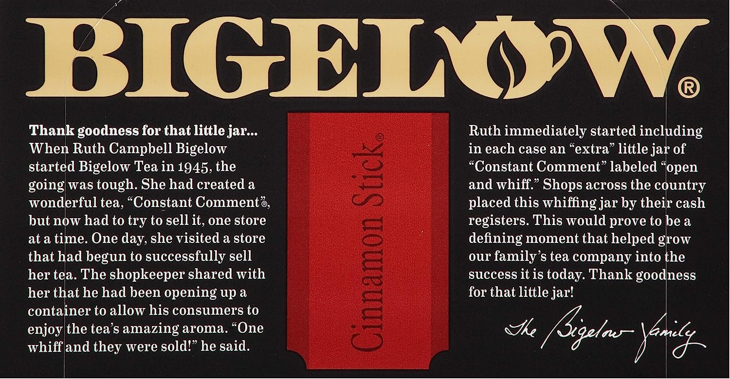 The Bigelow Tea Story Beginning the moment our founder, Ruth Campbell Bigelow created "Constant Comment" Tea in her kitchen in 1945, our family has focused on just one thing trying to make the finest teas possible. Over the years we have introduced many new flavors as well as concepts in tea. Today we offer a selection of deliciously different blends of teas and green teas, a wide variety of herbal teas and teas flavored with real fruit juice. Today Bigelow Tea is the number one specialty tea company in the United States. And to think it all began with the first legendary black tea flavored with golden orange rind and sweet spice "Constant Comment"Tea. Bigelow takes immense pride in providing the tea drinking community with the best tea at a great value. We only use hand- picked teas, real spices, flavors and herbs. The flavors and blends we have created are second to none. Some of our teas contain up to twenty different ingredients! And because tea is a leaf that can dry out we take steps to protect it. To keep the teas fresh, we seal our tea bags in protective packets. We simply have to protect those delightful flavors. That's why a cup of Bigelow Tea is aromatic and delicious; a true indulgence for the senses.