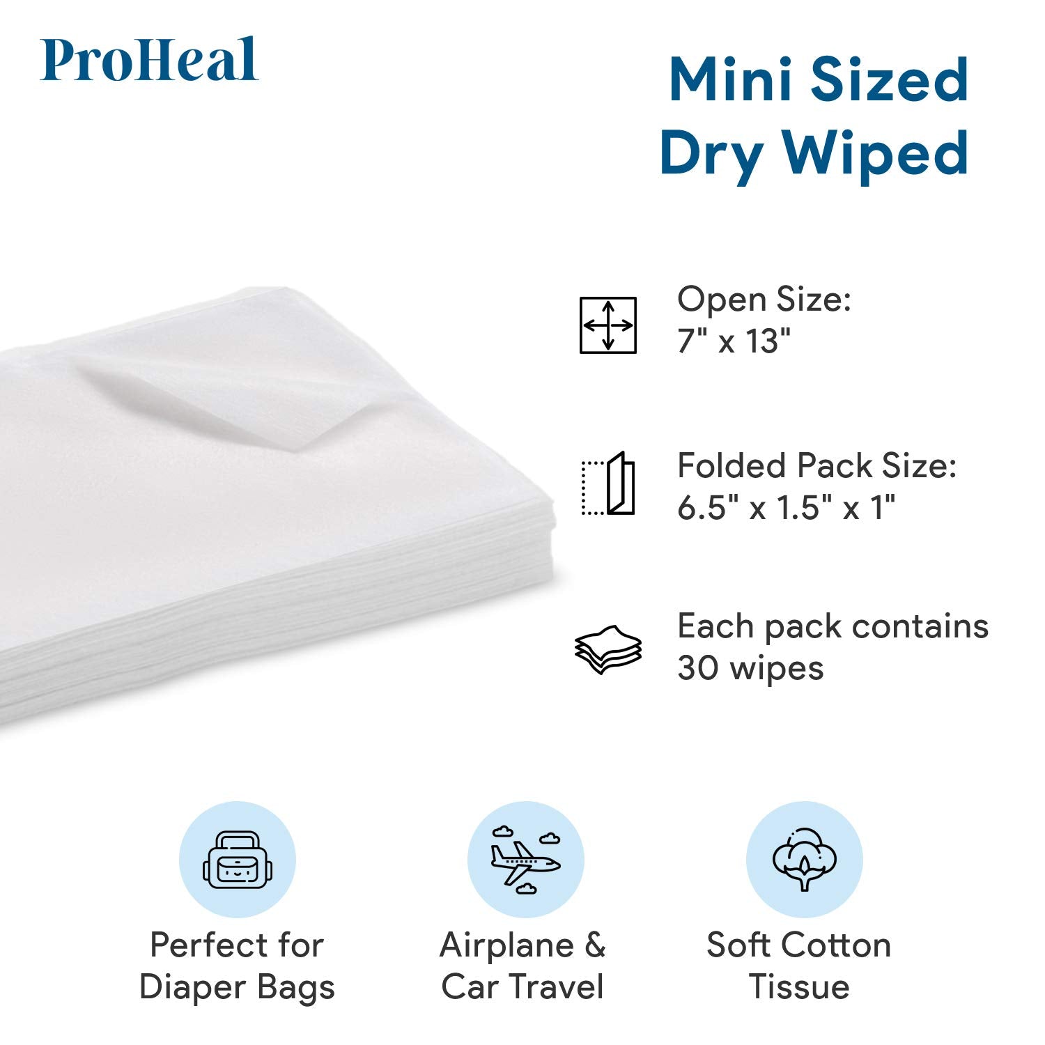 • SIZED TO GO: When opened, each dry wipe measures 7" x 13". Each package contains 30 wipes, and measures 6" x 3.5" x 1.5", perfect to toss in a diaper bag, backpack, make up or first aid kit. Made with ultra soft spun fabric, they are great for use as cotton tissues, or as a cloth to wipe a newborn, baby or toddler's face.