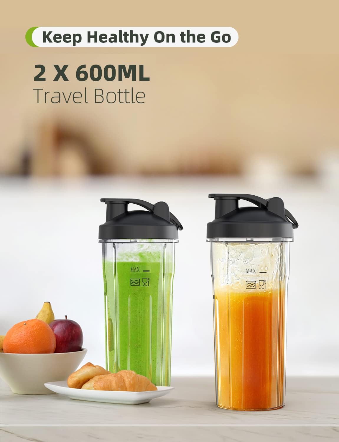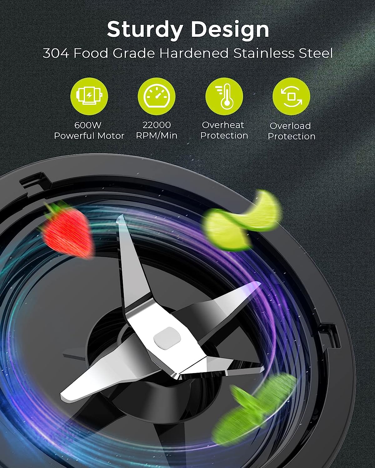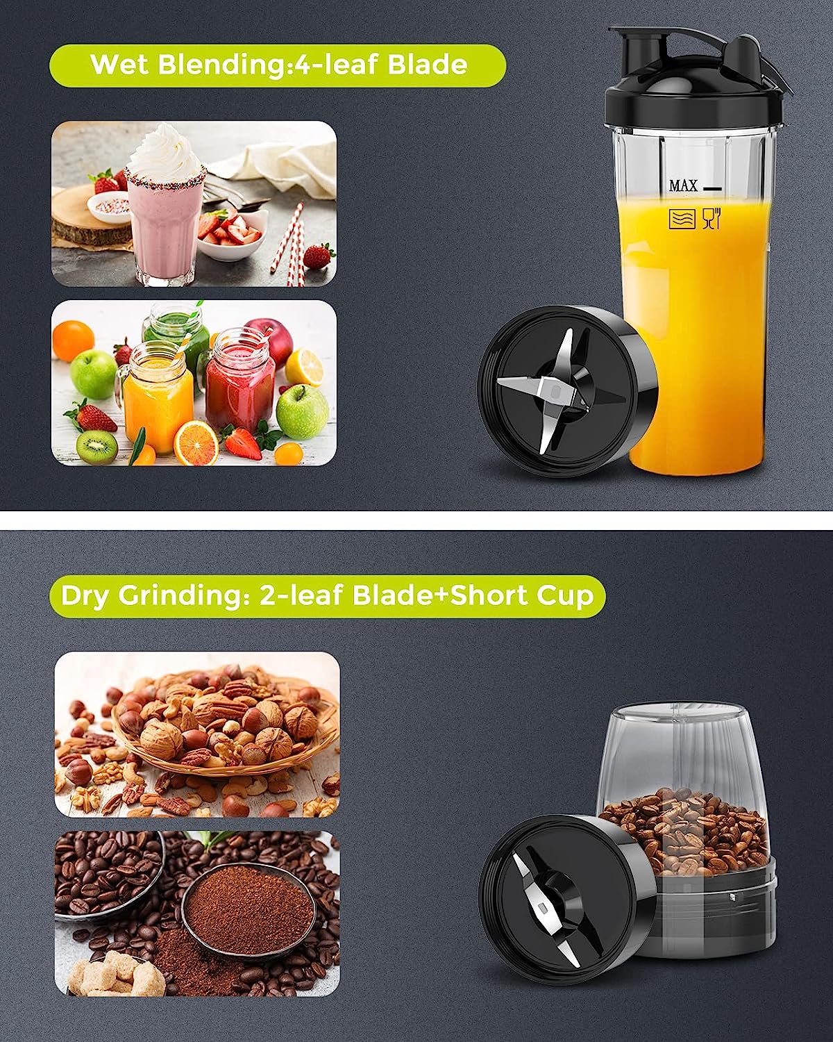 • 【304 Stainless Blades and 2 Cups】Blender blade is made of 304 stainless steel, featuring a 4-blade cross and a flat 2-blade design that can easily blend and extract nutrients. It comes with 2 * 20 oz BPA-Free blender cups, which can easily meet the needs of a family for making juices and smoothies.
