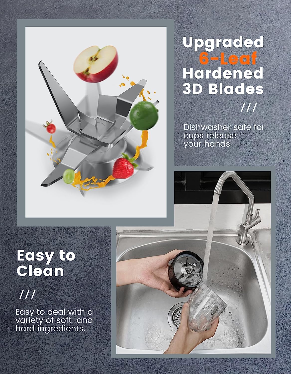 • 【Easy to Clean Smoothie Blender】Fill with 3/4 clear water, and a few liquid dish soaps, shake the personal blender cup, and press down for cleaning. The blade is partially removable and can be cleaned by just rinsing with tap water. The blender for shakes and smoothies cups and to-go lids is dishwasher safe (below 158℉).