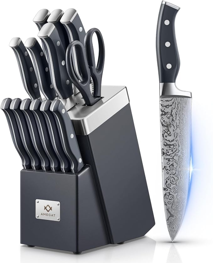 Knife Block Set, Knife Set with Advanced Self-Sharpening Technology, 14-Piece Waved Texture Kitchen Knife Set, Stainless Steel Knife Set with Block, Razor-Sharp Knives and Full Tang Handle