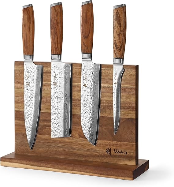 Wakoli Knife Block Sets, 4 Pieces Chef Knife Set with Block - Damascus Kitchen Knife Set with Magnetic Knife Block, Professional Kitchen Knife Block Set with Zebrawood Handles (Chef's Choice)