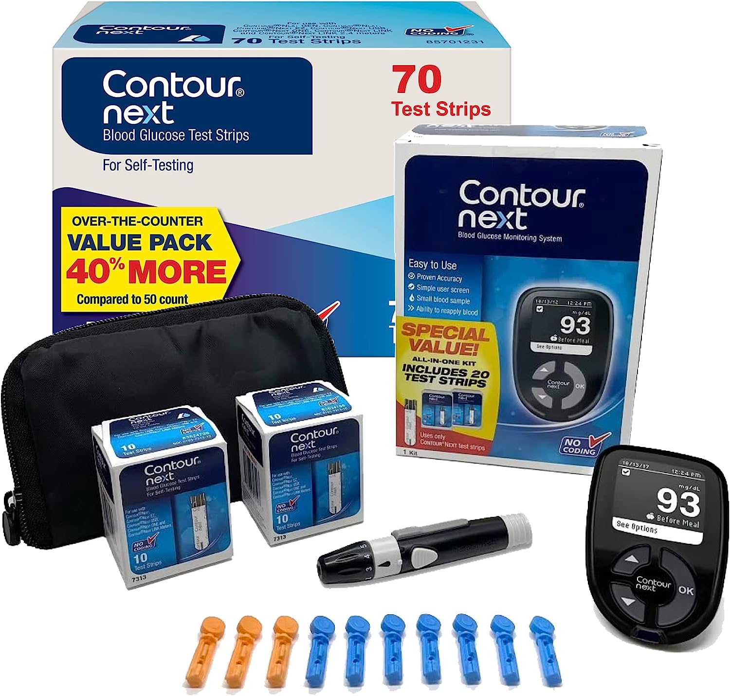 Help manage your diabetes with The CONTOUR NEXT blood glucose meter All-In-One Kit. The All-In-One Kit includes: The CONTOUR NEXT blood glucose meter, 20 CONTOUR NEXT test strips, user guide and quick reference guide, Microlet lancing device, 10 Microlet colored lancets, logbook and carrying case, and warranty card. The CONTOUR NEXT blood glucose monitor is ready to use out of the box! The CONTOUR NEXT blood glucose monitor features easy-to-read results with no coding technology for one less step in the testing process and to eliminate user miscoding errors. Read user guide before use. The CONTOUR NEXT blood glucose meter offers proven accuracy(1) with personalized HI/LO target range and summary of your blood glucose test results and also provides 7, 14 and 30 day averages of your blood glucose levels. This monitoring system also features Second-Chance Sampling, allowing you to apply more blood to the test strip within 20 seconds, which may help prevent wasting test strips and save money. (2)