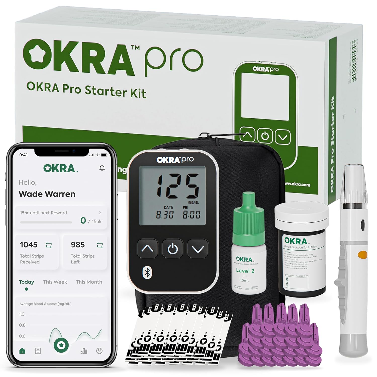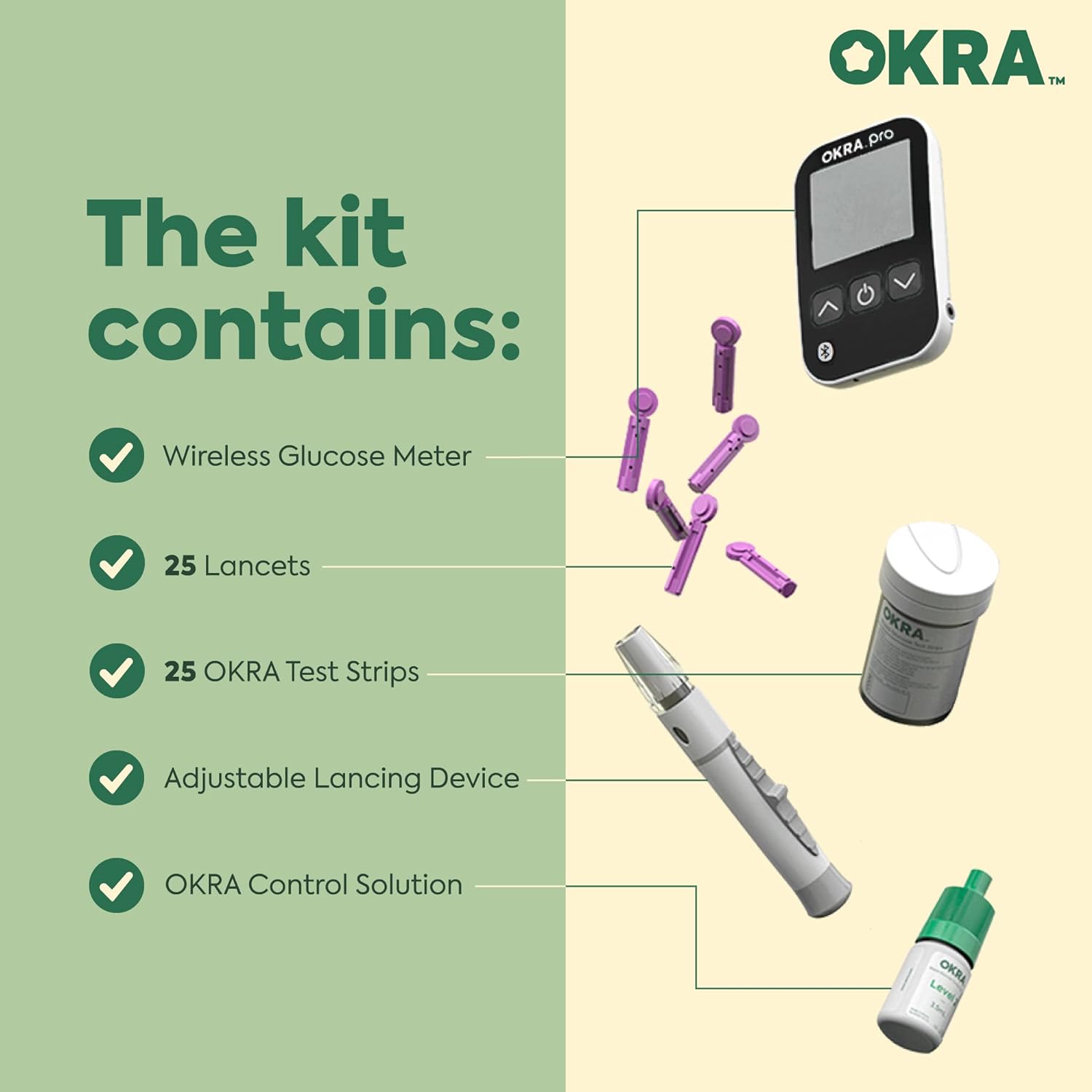 Okra Pro Glucose Monitoring Kit: Meter, 25 Test Strips, Lancets, Lancing Device & Case – Syncs with Free App