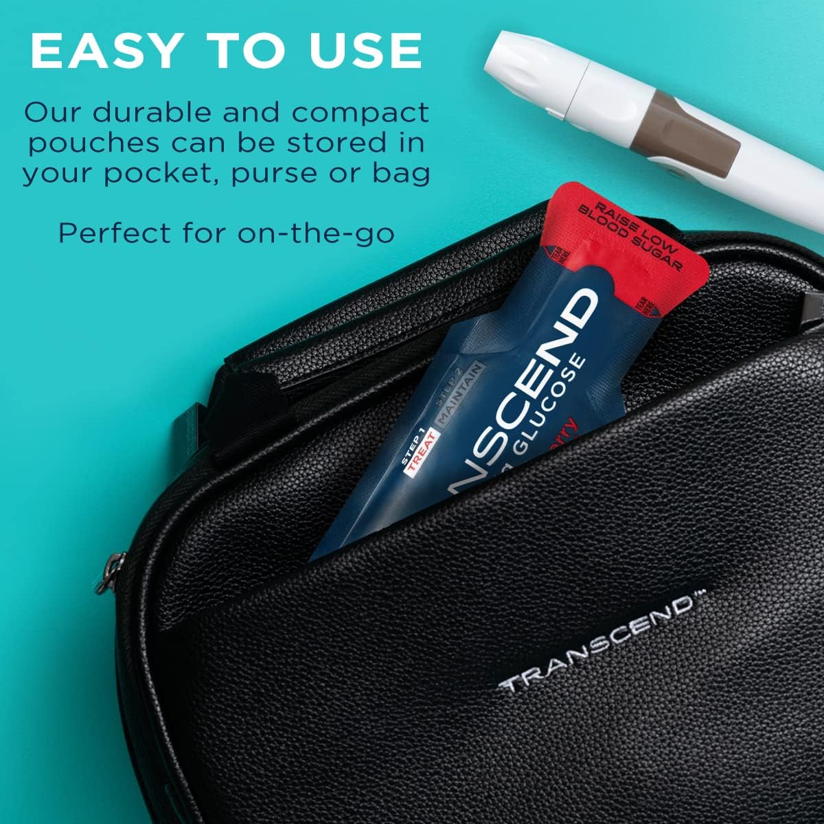 • EASY TO USE: The durable and compact pouches can be stored in your pocket, purse, bag, backpack and even in your car. Transcend Glucose Gel Packs will never melt or freeze so you can always keep them on hand. Simply tear away the tab and squeeze the pack into your mouth for efficient & delicious blood sugar support. No scissors, no cap & no water required; these gel packs are truly no fuss.