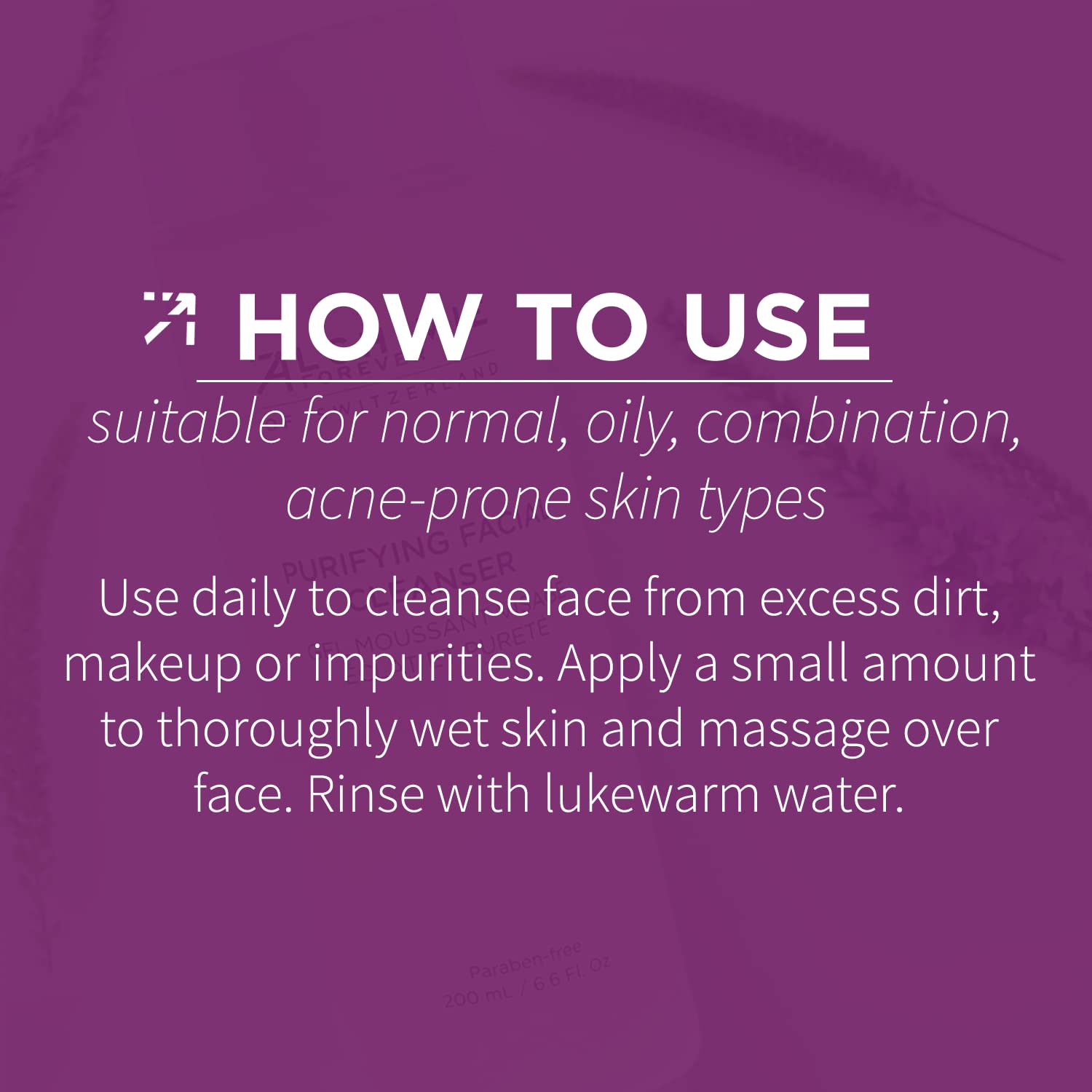 • APPLY DAILY TO FACE AND RINSE: Use daily to cleanse face from excess dirt, makeup or impurities. Apply a small amount to thoroughly wet skin, work into a lather, and massage over face. Rinse with lukewarm water.